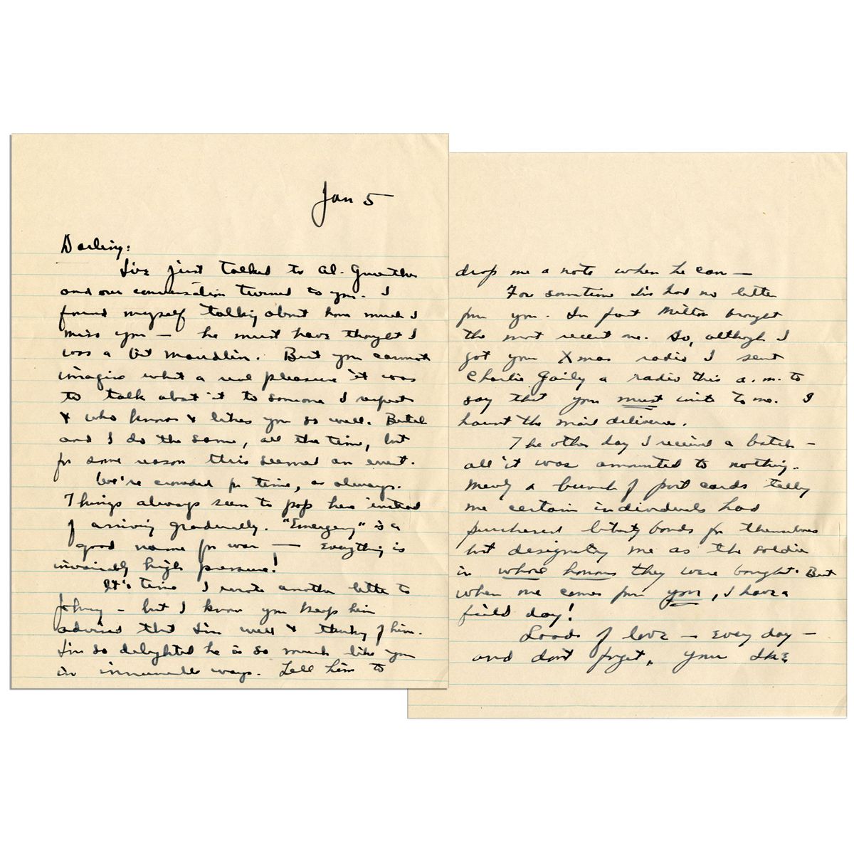General Dwight Eisenhower autograph letter signed to his wife, Mamie, dated 5 January, (1943). As Supreme Commander, Allied Force of the North African Theater of Operations, with the invasion of North Africa behind him, Eisenhower would have been writing from Allied Forces Headquarters in Algiers. Letter reads in part, ''I've just talked to Al Gruenther and our conversation turned to you. I found myself talking about how much I miss you -- he must have thought I was a bit maudlin. But you cannot imagine what a real pleasure it was to talk about it to someone I respect & who knows & likes you so well...We're crowded for time, as always. Things always seem to pop here instead of arriving gradually. 'Emergency' is a good name for war -- everything is invariably high pressure!...For some time I've had no letter from you. In fact [his brother] Milton brought the most recent one. So, although I got your Xmas radio I sent Charlie Gailey a radio this a.m. to say that you must write to me. I haunt the mail deliveries. The other day I received a batch -- all it was amounted to nothing. Merely a bunch of post cards telling me individuals had purchased liberty bonds for themselves but designating me as the soldier in whose honor they were bought. But when one comes from you, I have a field day!...'' Eisenhower signs ''Your Ike''. 8'' x 10.25'' 2pp. letter is in fine condition.