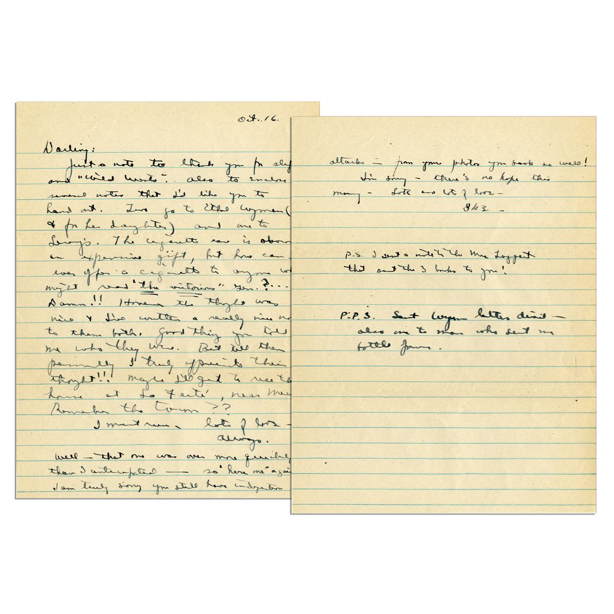 Dwight Eisenhower autograph letter signed ''Ike'' as Supreme Commander of Allied Expeditionary Forces, dated 16 October [1944]. Affectionately referring to his wife, Mamie, as ''Darling,'' Eisenhower thanks her for various gifts received and updates her on his whereabouts, briefly mentioning Meaux, France. Letter is written in ink on two pages and reads in full: ''Darling: Just a note to thank you for slippers and 'Wild Wests.' Also to enclose several notes that I'd like you to hand out. Two go to Ethel Wyman (hers and for her daughter) and one to the Levys. The cigarette case is obviously an expensive gift, but how can I ever offer a cigarette to anyone who might read 'The victorious' Gen.? -- Damn!! However the thought was nice and I've written a really nice note to them both. Good thing you told me who they were. But tell them personally I truly appreciate their thought!! Maybe I'll get to use the house at La Ferte, near Meaux. Remember the town?? I must run. Lots of love, always. Well that one was over more quickly than I anticipated -- so 'here me' again. I am truly sorry you still have indigestion attacks -- from your photos you look so well! I'm sorry there's no hope this morning -- Lots and lots of love -- Ike. P.S. I sent a note to the Mrs. Loggert that sent the 3 books to you! P.P.S. Sent Wagner letters direct -- also one to man who sent me bottle opener.'' 2pp. letter measures 8'' x 10.5''. Minor toning throughout, else near fine.