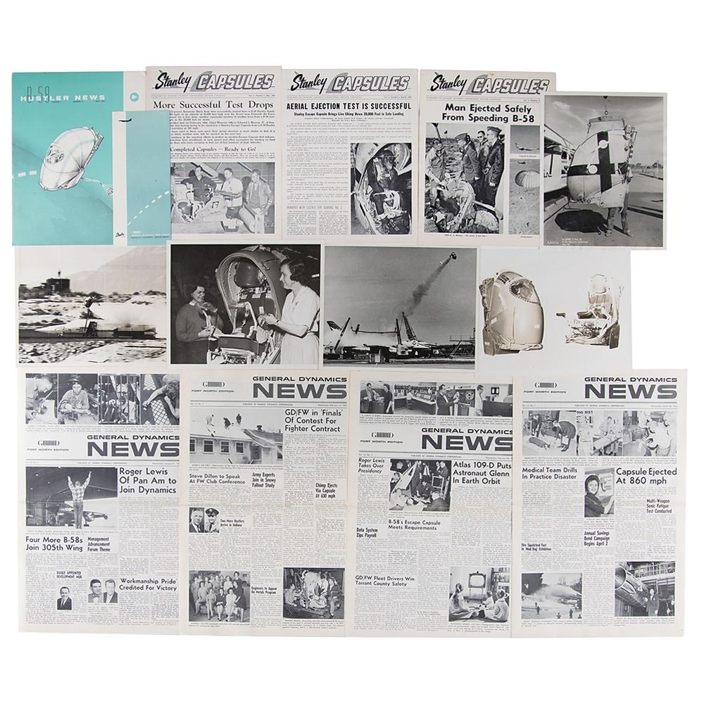 Interesting archive of ephemera and photography pertaining to the escape capsule developed by Stanley Aviation for the General Dynamics/Convair B-58 Hustler, the first operational bomber capable of Mach 2 flight. The group consists of a Stanley Aviation/General Dynamics brochure describing the escape capsule, "designed to keep pace with the Hustler's supersonic speeds"; an original issue of the Convair/General Dynamics "B-58 Hustler News" newsletter, discussing the new and innovative safety system at length; five original vintage glossy 8 x 10 photos showing the capsule and its ejection tests; three "Stanley Capsules" newsletters, dated from March 1962 to May 1962, documenting the testing of the capsule ("Stanley Escape Capsule Brings Live Chimp Down 20,000 Feet to Safe Landing," "Man Ejected Safely From Speeding B-58"); and five issues of the Fort Worth edition of General Dynamics' newsletter, dated January 1962 to April 1962, offering general company news ("Atlas 109-D Puts Astronaut Glenn In Earth Orbit") as well as updates on the B-58 and its escape capsule project ("Chimp Ejects Via Capsule At 630 mph"). In overall very good to fine condition, with a couple pieces of tape to one of the Fort Worth newsletters.