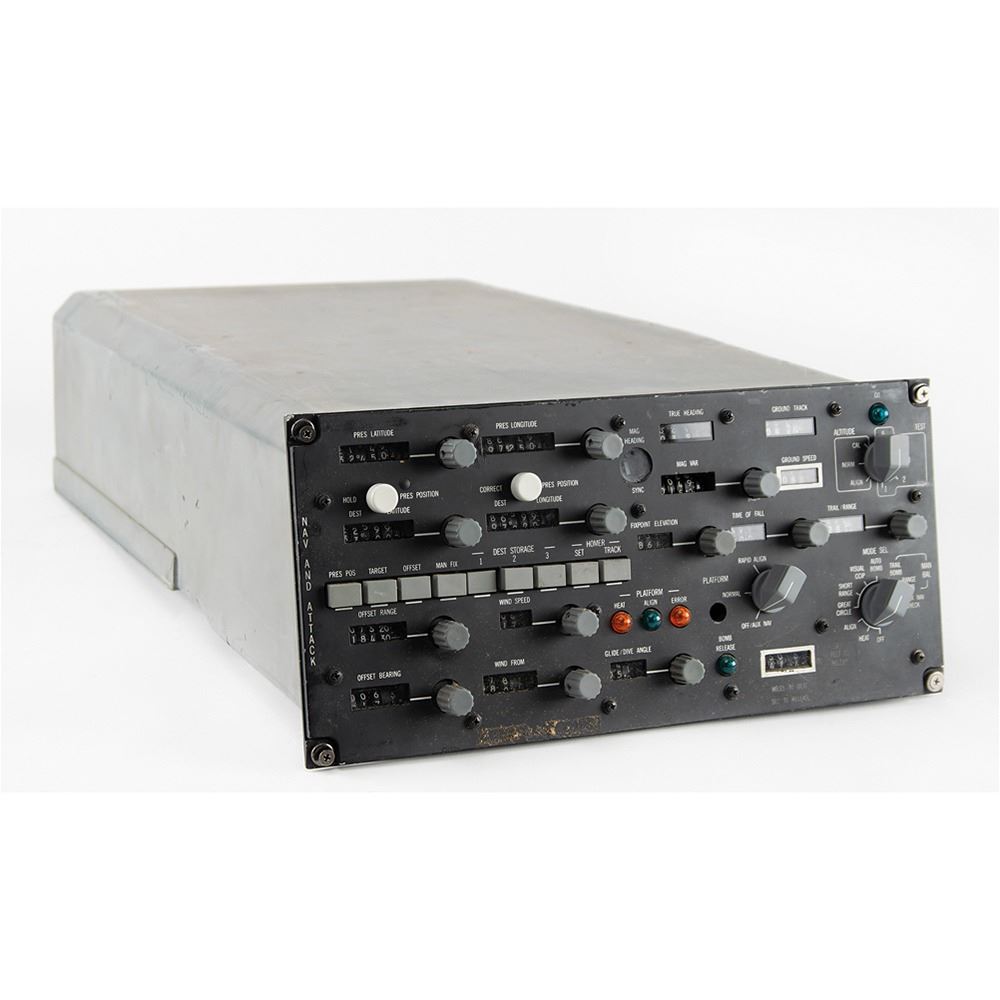General Dynamics F-111 Aardvark CP812/AJQ-20A Navigation Computer, measuring approximately 16" x 8" x 24", with a plate to the rear: "CP812/AJQ-20A, F04606-84-G-1017, Spec. No. ZE00002, Ser. 586, P/N 671480-2, Mfr: 06481." The main panel, labeled "Nav and Attack," has indicators for present coordinates and destination longitude/latitude, true heading, ground track, ground speed, wind speed, miles to destination, and other important navigational data. Additionally, it features a "bomb release" indicator light and mode selection knobs. A counter to the rear indicates 1114 hours of use.