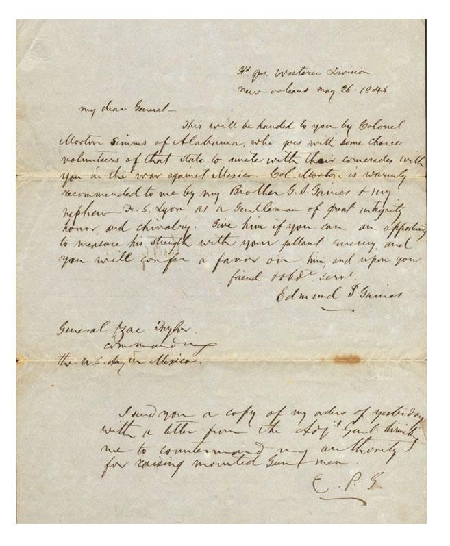 [Zachary Taylor] 1846. New Orleans. 1 pp. Autograph Letter Signed. Superlatively important historical Mexican American war letter regarding Gaines' unauthorized call for troops written just 13 days after war was declared: Hd Qqs Western Division New Orleans May 26, 1846 My Dear General - This will be handed to you by Colonel Morton Simms of Alabama, who goes with some choice volunteers of that state, to unite with their comrades with you in the war against Mexico. Col. Morton is warmly recommended to me by my brother G. S. Gaines & my nephew H. S. Lyon, as a Gentleman of great integrity honor and chivalry. Give him if you can an opportunity to measure his strength with your gallant enemy and you will confer a favor on him, and upon you Friend & obdt sert Edmund P. Gaines General Zachary Taylor Commanding the US Army in Mexico. (Postscript) I send you a copy of my orders of yesterday with a letter from the Adt. Genl. directing me to countermand my authority for raising mounted Gun men. E.P.G Exceptional content related to Gaines controversial decision to call up volunteers during the Mexican-American War. Very Fine.