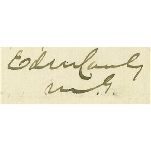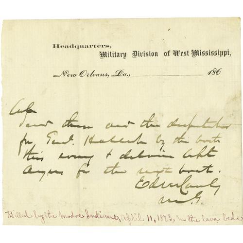 <B>General Edward R.S. Canby: Scarce Orders in His Hand.</B></I> On notecard letterhead of "<I>Headquarters, Military Division of West Mississippi, New Orleans, La., ,,,,186_.</B></I>" Undated, but almost certainly 1864. The order reads, "<I>Send these and the dispatches for Gen. Halleck by the boats and deliver for the next boats, Edw. Canby M.G.</B></I>" The document measures 5" x 4.25", and is in very nice condition. Attractive display presence.<BR><BR><b>Shipping:</b> Small Flat (<a target="_blank" href="http://www.heritageauctions.com/common/shipping.php">view shipping information</a>)