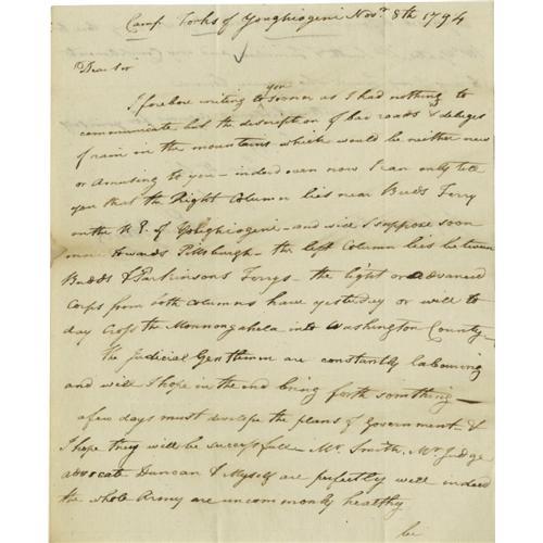 <B>General Edward Hand writes en route to suppress the Whiskey Rebellion</B></I><BR><BR> <B>Edward Hand (1744-1802) American General during the Revolution, Autograph Letter Signed,</B></I> "<I>Edwd Hand</B></I>", one page 7.5" x 9", "<I>Camp Forks of Youghisgeni</B></I>", November 8, 1794 to Jasper Yates. "<I>...the description of bad roads & deluges of rain in the mountains which would be neither new or Amusing to you -- indeed even now I can only tell you that the Right column lies near buds Ferry on the N E of Youhiogeni [?] -- and will I suppose soon move towards Pittsburgh -- the left Column lies between Buds & Parkinson's Ferrys - the light or advanced Corps from both Columns have yesterday or will to day Cross the Monongahela into Washington County - The Judicial Gentlemen are constantly laboring and will I hope in the end bring forth something - a few days must develop the plans of government - & I hope they will be successful - Mr Smith, Fr Judge advocate Duncan & Myself are perfectly well indeed the whole Army are uncommonly healthy...</B></I>" The Whiskey Rebellion arose with the 1791 tax issued on distilled spirits, a measure supported by Hamilton in his role as Secretary of the Treasury to pay down the enormous debt incurred by the United States during the American Revolution. The tax levied a six-cent per-gallon tax on large volume distillers, while smaller operations were forced to pay nine-cents per-gallon. Most of the distillery operations in the Appalachian West were of the smaller variety and were thus adversely impacted by the tax. Over the next several years, a nascent rebellion grew initially in the form of non-payment of the tax then escalated into harassment directed at tax collectors in regions stretching form Georgia to Pennsylvania. After the tarring and feathering of a tax collector near Pittsburgh in the summer of 1794 (resulting in his death) and other mob actions, President Washington, remembering well the threat of Shay's Rebellion nearly ten years earlier, invoked the Militia Act of 1792. He summoned the militias of Virginia, Maryland and Pennsylvania to march to Pittsburgh. A force of 13,000, under the command of Washington, Hamilton and Henry Lee, marched into western Pennsylvania in September. In the wake of this massive show of force, the rebels quickly disappeared into the woods and the rebellion was easily suppressed. They managed to capture twenty barefoot men who were paraded down Market Street in Philadelphia. Two of them were charged with treason and sentenced to the gallows but Washington pardoned them on the grounds that one was a "simpleton" and the other "insane." The suppression of the rebellion had the unanticipated consequence of forcing many small whiskey producers further west into Kentucky and Tennessee, far out of reach of federal authority. Interestingly, in these regions distillers found excellent corn-growing country and discovered smooth, limestone-filtered water -- both proving quite suitable for the blending of the finest whiskey. The tax itself, largely uncollectible outside of western Pennsylvania, was repealed in 1802. Fine condition. From the Henry E. Luhrs Collection.