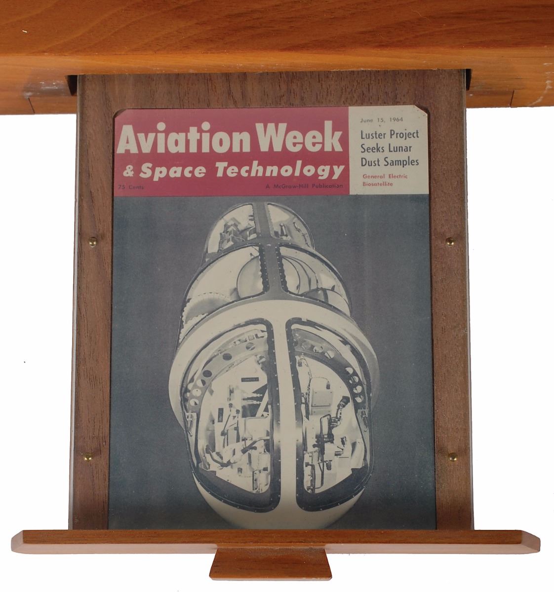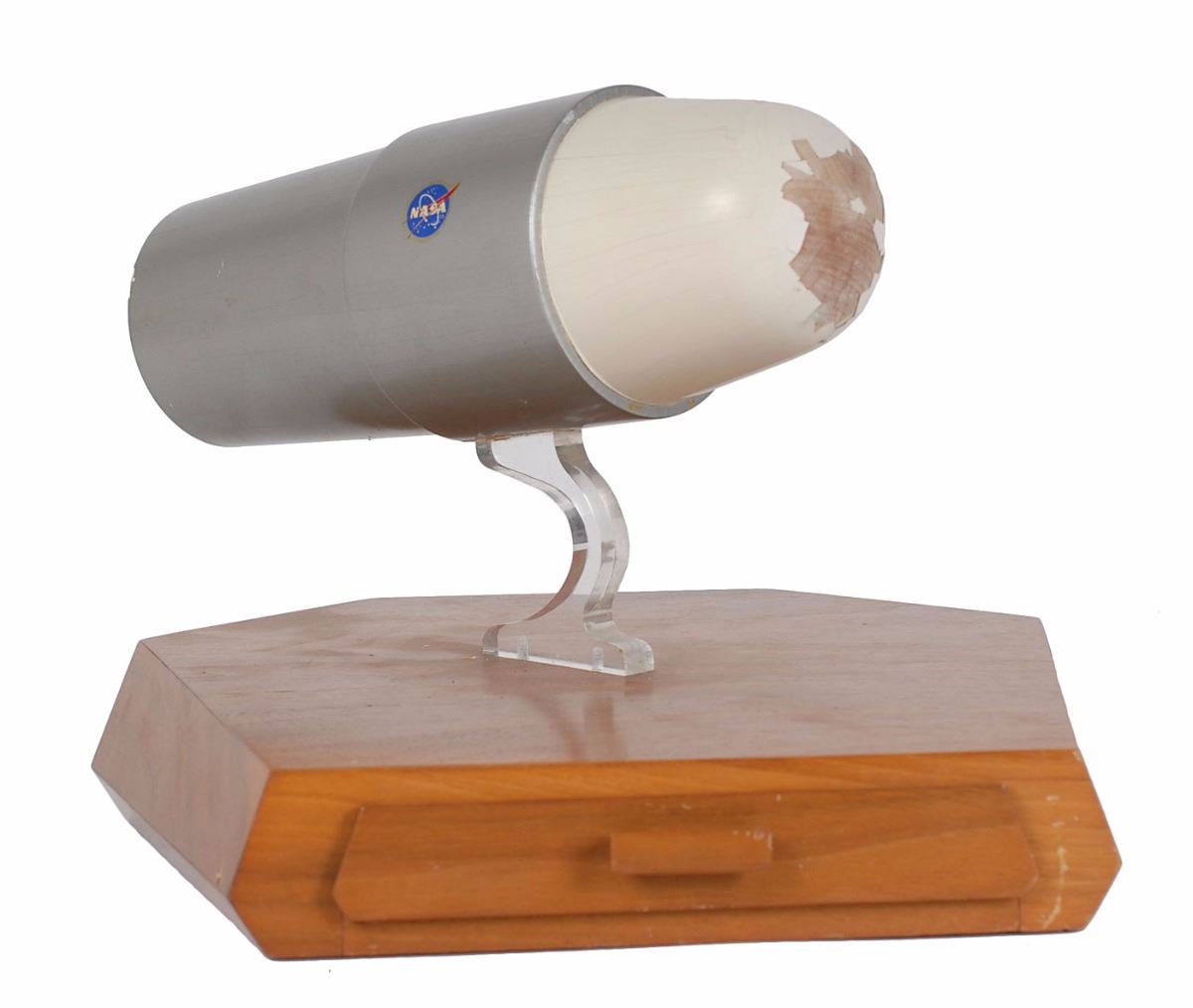 Uncommon 1/15 scale General Electric bio-satellite model, measuring 7.75? long, and bearing NASA and General Electric logo stickers. Includes original 9.25 x 9.25 wooden base, with front drawer revealing a miniaturized front cover of an Aviation Week & Space Technology magazine cover from June 15, 1964, showing the interior of the bio-satellite. Bottom of base bears an affixed General Electric label from the Re-Entry Systems Department, and is engraved above, “2.” In fine condition.