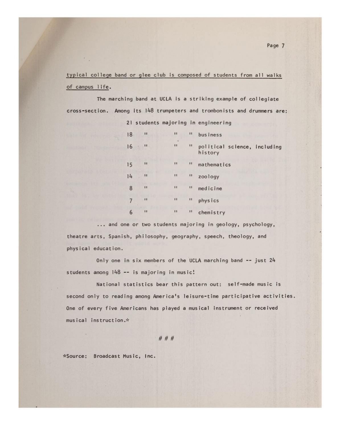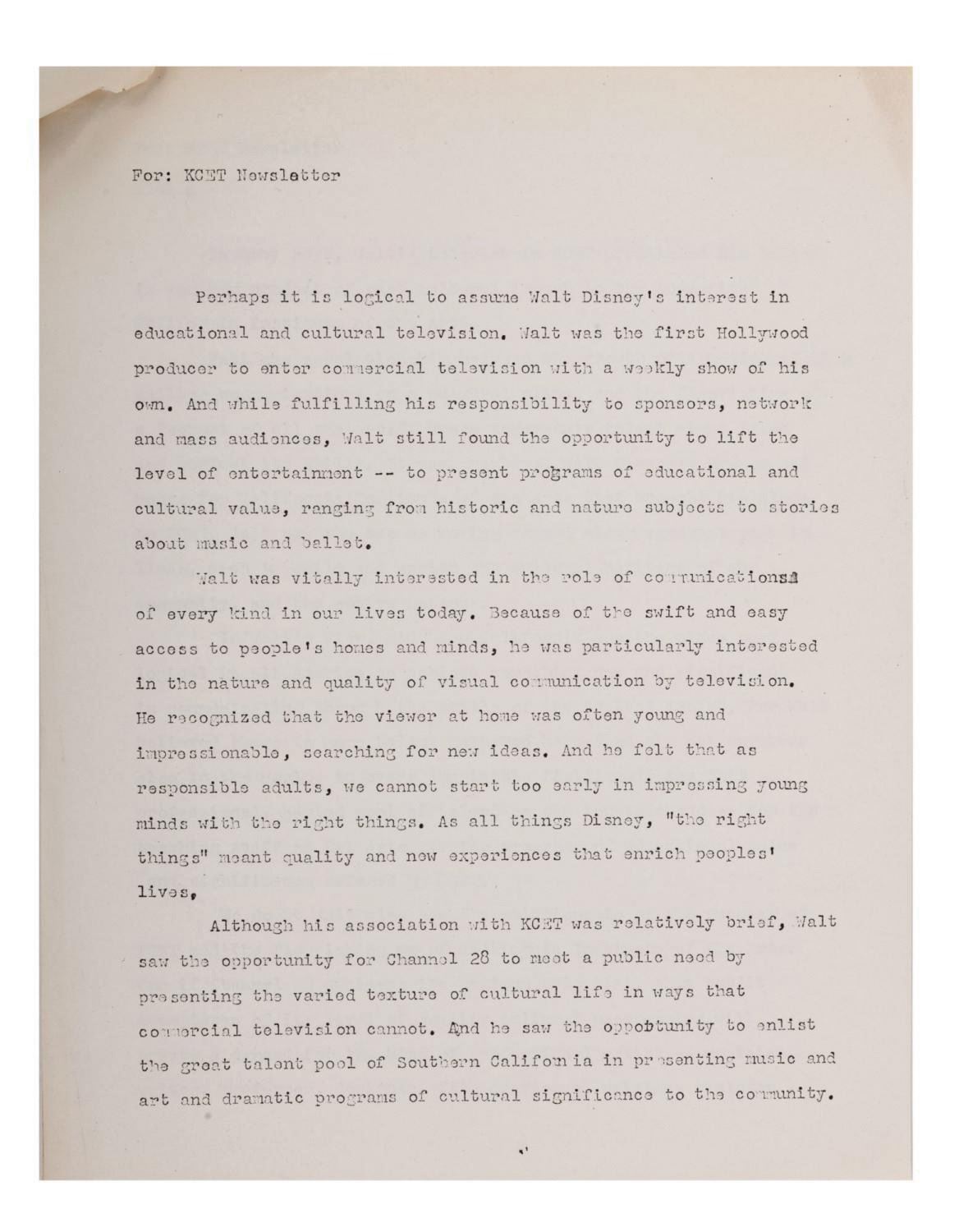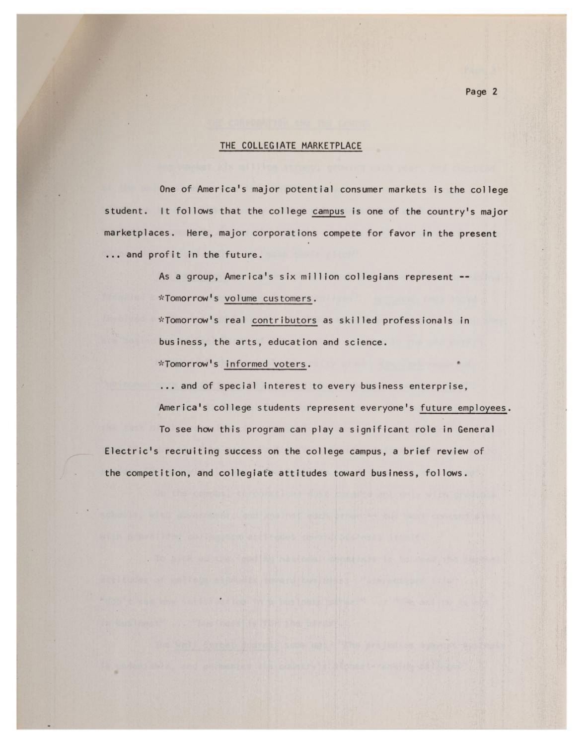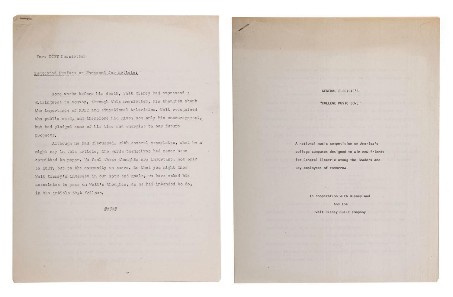 (Disneyland, 1967) A proposal for a General Electric College Music Bowl in cooperation with Disneyland and the Walt Disney Music Company. General Electric and Disneyland partnered to make Progressland a reality and according to the new proposal, the recruiting of new entertainment talent from college campuses would be achieved through the synergistic relationship with Disneyland performing a role as the destination for the Finalists. Measuring 8.5"x11", the 30-page document is in very good condition with minor wear, creases, and folds to some pages from use.