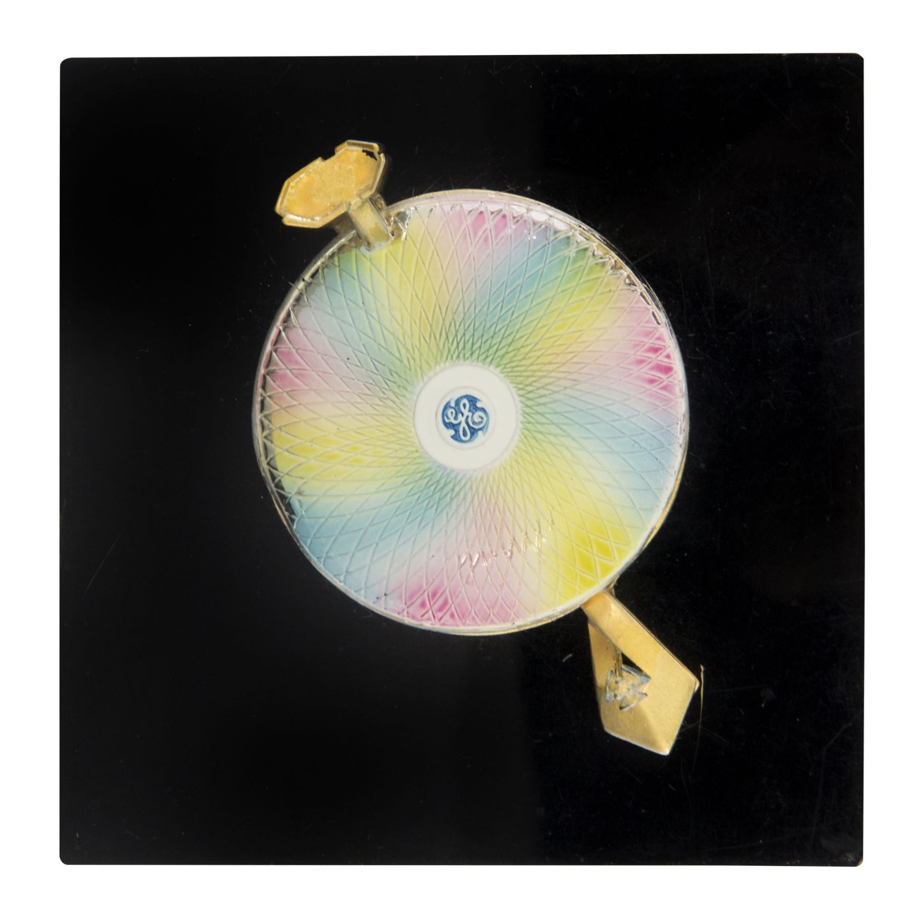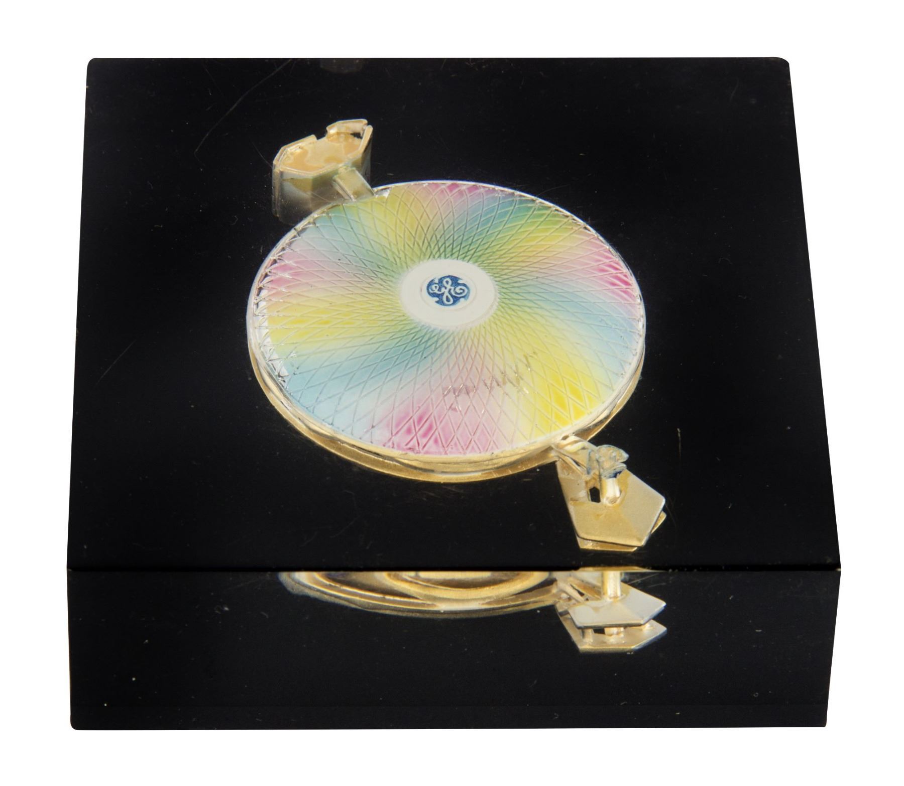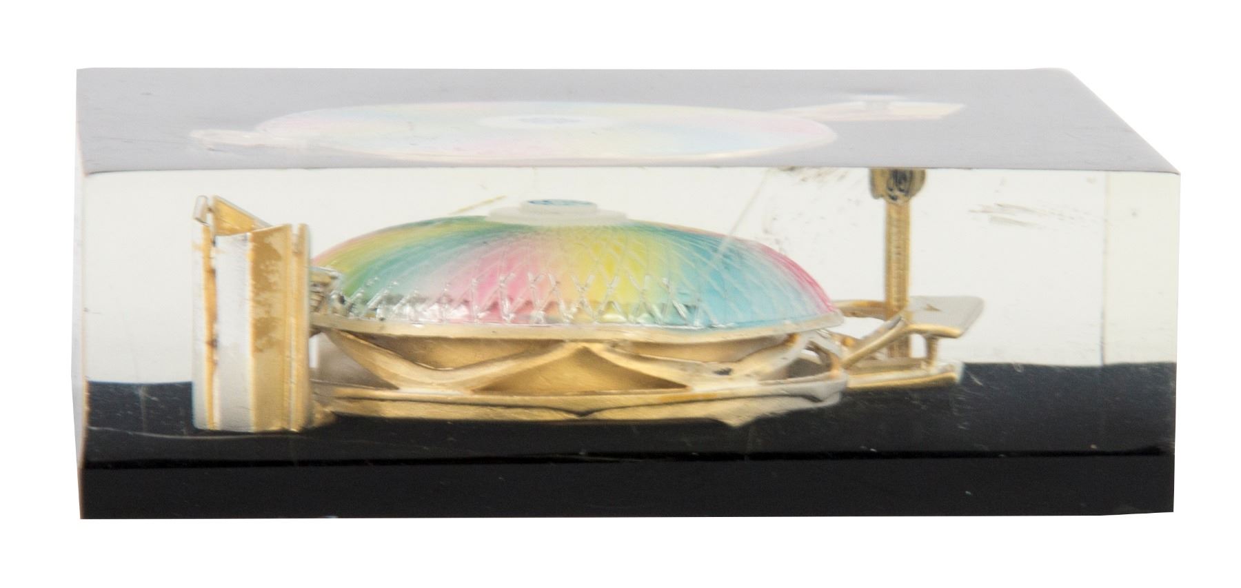 (World's Fair, c.1964) A lucite paperweight featuring a miniature replica of General Electric's "Progressland Pavilion" from the 1964-65 New York World's Fair. The paperweight is believed to have been given as a VIP gift to promote General Electric's new pavilion, and has a black base which helps the colors on the roof of the "Carousel" stand out. The paperweight measures approximately 3"x3" and 1" tall, and the condition is very good with minor wear.