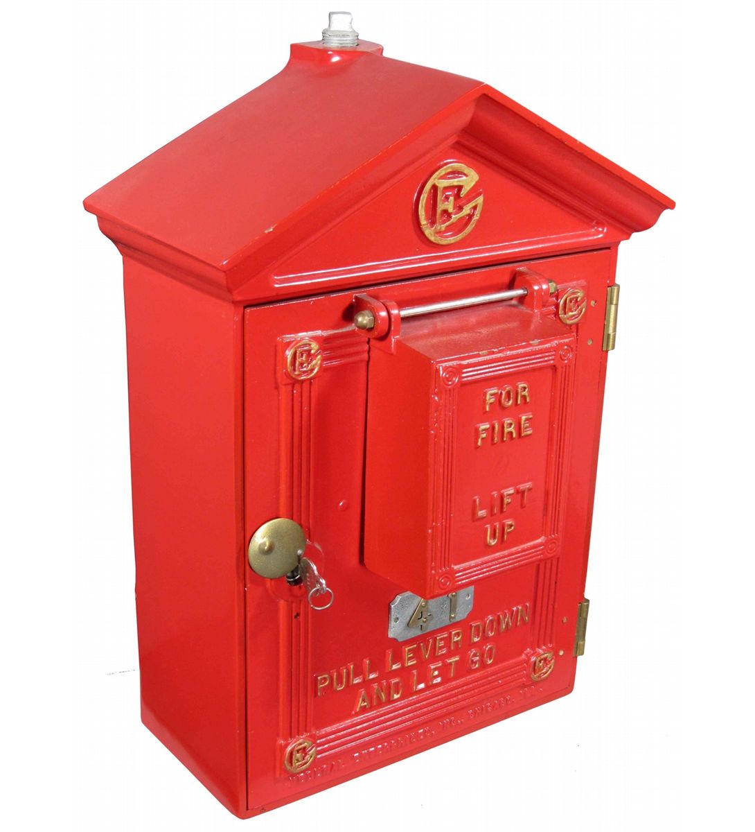 General Enterprises Outdoor Alarm Box #41. Box only, no guts. Restored condition, comes with key. 12 1/4 X 17 X 7 inches.