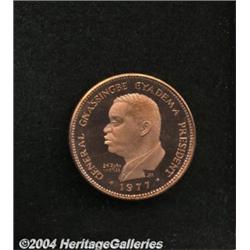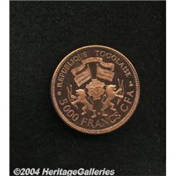 <B>General Eyadema Commemoratives, </B></I>six coins struck by a private in mint in Spain honoring the 10th year of General Eyadema's tenure as President: KM8 5000 Francs 1977 silver, choice Proof regular issue, plus an aluminum pattern KM-E9 and bronze piefort pattern, KM-P1, plus silver piefort 10,000 Francs 1977 type of KM9, KM-P3a, copper piefort KM-P3 and aluminum pattern KM-E11. All are choice prooflike UNC and this series is sought-after by African specialists since the coins were regular issues. <B>Sold as is, no returns for any reason.</B></I> 6 coins <BR><BR><B>Important notice:</B> Heritage usually auctions material at the rate of 200-250 lots per hour. On some occasions eBay Live bid software or the Internet may not be able to keep up with the pace of the auction. We recommend placing a realistic absentee bid now as insurance to avoid disappointment. Occasionally the auctioneer may eliminate or reject an eBay Live bid, and the auctioneer may also reopen a lot after the close of the eBay live bidding (usually because we missed an audience bid), and may reject your bid even if it shows you as the winning bidder. By bidding via eBay Live, you agree that Heritage may award the lot to another bidder at its sole discretion under the circumstances described above or any other reasonable circumstances. Since eBay bids are not shown to us until we open the lot on the floor, we treat those bids just like floor bids. In most cases the floor responds before the eBay bid is presented to us, due to Internet lag time, so for consistency we have made it a policy that floor bids are always considered first over tie eBay live bids. Also please note that all Heritage lots purchased through eBay Live carry a 20% Buyer's Premium. Please make sure you read the Terms and Conditions before you bid.
