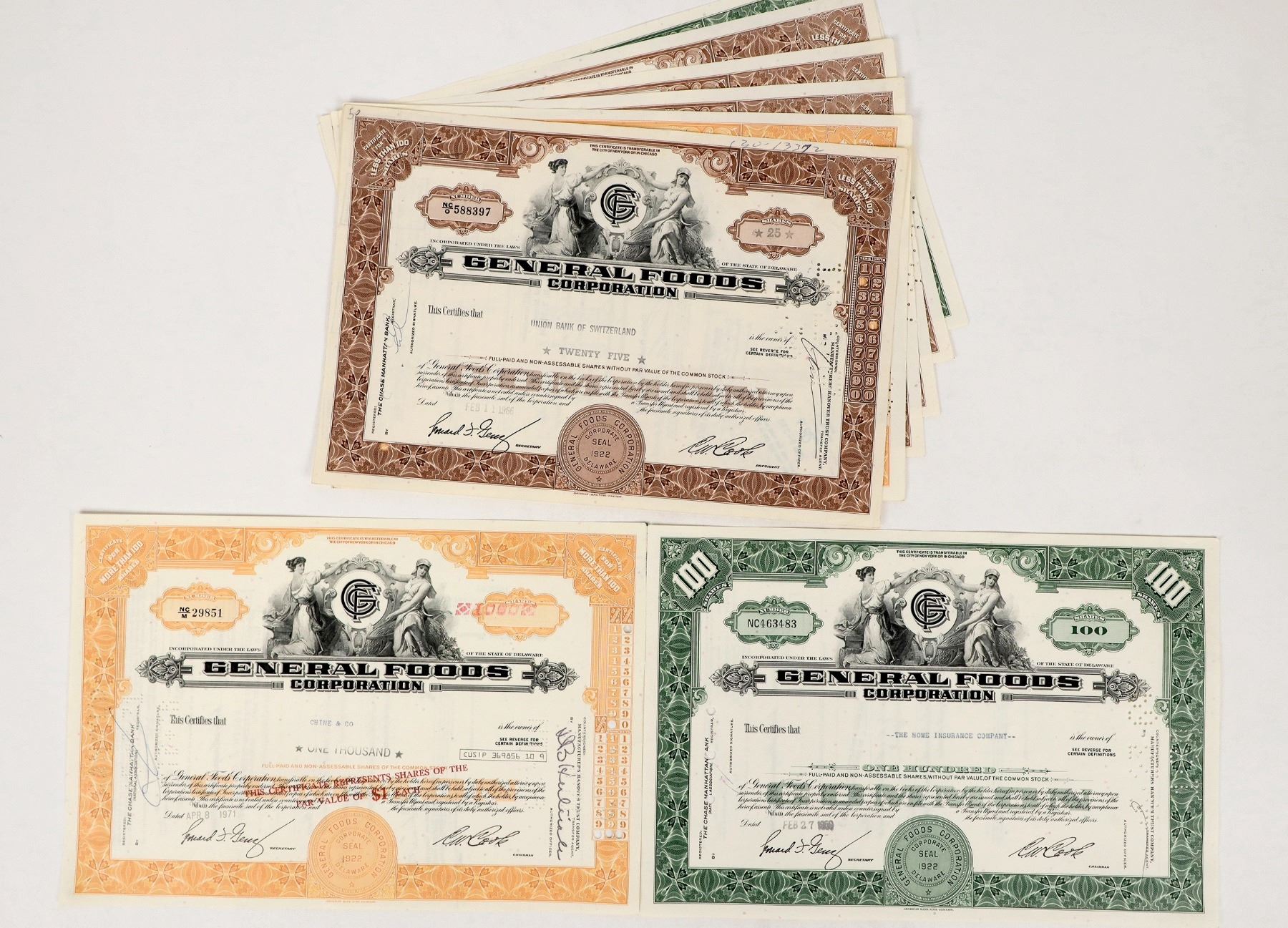 This lot holds 8 stock certificates for the General Foods Corp. Please see photo for details .