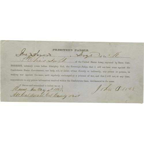 <B>General Forrest Parole For Union Prisoner.</B></I> Partially printed document, PRISONER'S PAROLE, one page, 8" x 3.5", Rome, Georgia, May 4, 1863. It reads: "<I>I, Jno. Severs, a Srgt of Co."K", 3rd Ohio Inft of the United States Army, captured by Brig. Gen. Forrest, solemnly swear before Almighty God, the Sovereign Judge, that I will not bear arms against the Confederate State Government, nor help, aid, or assist, either directly or indirectly, any person or persons, in making war against the same, until regularly exchanged as a prisoner of war, and that I will not, at any time, communicate to any person information received within the Confederate lines, detrimental to the same.</B></I>" The document is signed by a Colonel A.W. Caldwell, C.S.A. Printed on light blue Confederate paper. Smoothed folds, else fine condition. The Union soldier paroled here was one of over 1,500 captured by Forrest on May 3, 1863 when he put an end to the irritating raids of Yankee Colonel Abel Streight.<BR><BR><b>Shipping:</b> Small Flat (<a target="_blank" href="http://www.heritageauctions.com/common/shipping.php">view shipping information</a>)