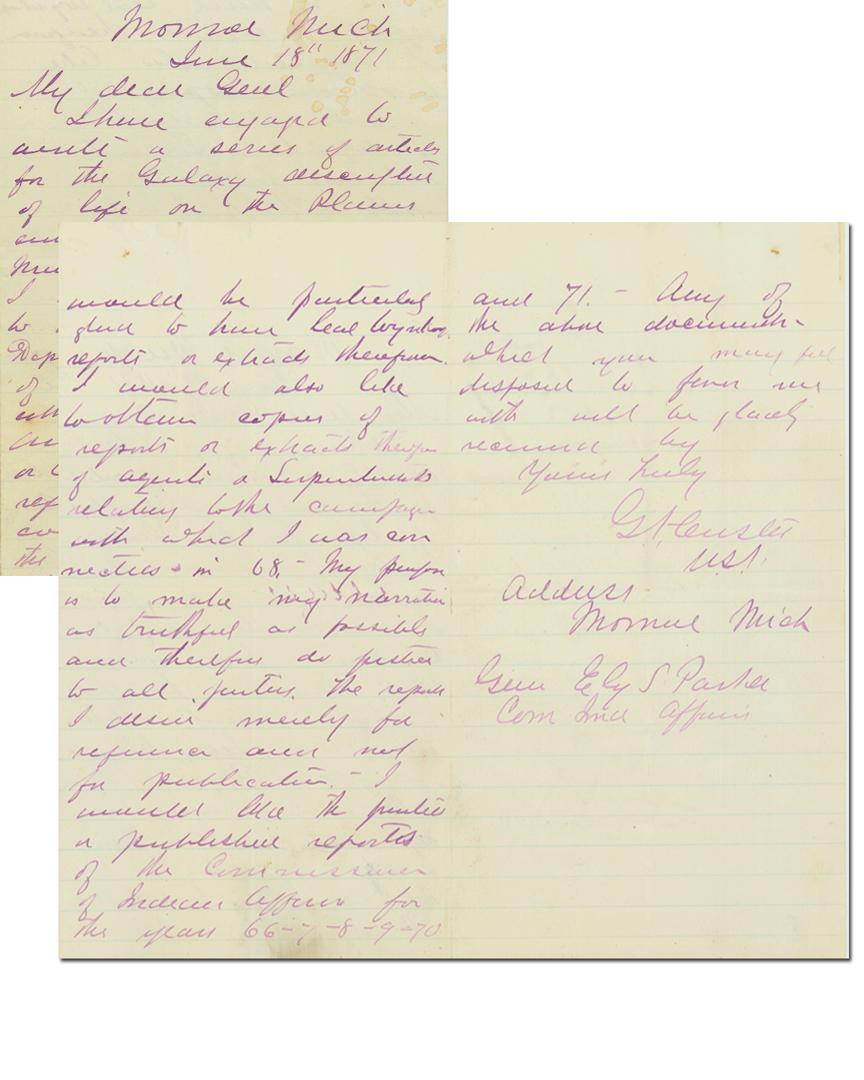 General George Armstrong Custer autograph letter signed ''G.A. Custer'', dated 18 June 1871 from Monroe, Michigan. Letter, written in cursive, is addressed to Commissioner of Indian Affairs Ely S. Parker, asking him for reports on the Plains Indians and related military campaigns in order to write articles for ''The Galaxy'' and compile his ''My Life on the Plains.'' Five years later, Custer would be killed and his troops annihilated by Sioux and Cheyenne warriors led by Sitting Bull and Crazy Horse at Little Bighorn. Letter reads in part, ''My dear Genl, I have engaged to write a series of articles for the Galaxy descriptive of life on the Plains embracing personal sketches, marches and campaigns. I would be very glad to obtain from your Dept copies of the reports of Indian agents relating to the Sioux, Cheyenne, Arapahos, Apaches (Plains) or Comanches. ''...having any reference to General Hancock's expedition or to the causes which led to it or its results. I would be particularly glad to have Col. Wynkoop's Reports or extracts therefrom. I would also like to obtain copies of reports or extracts therefrom of agents or Superintendents relating to the campaign with which I was connected in 68. -- My purpose is to make my narrative as truthful as possible and therefore do justice to all parties. The reports I desire merely for reference and not for publication. -- I would like the printed or published reports of the Commissioner of Indian Affairs for the years 66-7-8-9-70 and 71. -- Any of the above documents which you may feel disposed to favor me with will be gladly received by / Yours Truly / G.A. Custer / U.S.A.'' Letter, written in purple ink on three pages, has some dampstaining and toning, else near fine condition, with a bold signature.
