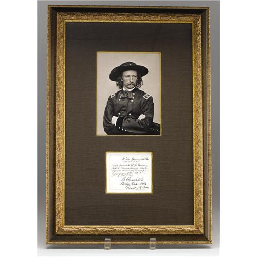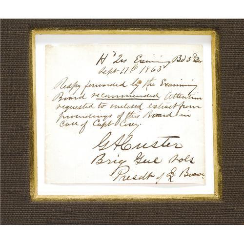 <B>General George A. Custer 1863 Autograph Note Signed "<I>G.A. Custer</B></I>",</B></I> one page, 3.5" x 3", framed and matted with a print of Custer in Major Generals uniform, under glass (14.25" x 21" overall), np, September 11, 1863. The note reads: <I>"H'qrs Examining Board 3rd Div., September 11, 1863, Reply forwarded by the Examining Board recommended attention requested to enclosed extract from proceedings of this board case of Capt. Casey. G.A. Custer, Brig. Gen. Vols. Pres. Of Ex. Board." On 26 June 1863, Custer was appointed the "Brevet" rank of Brigadier General of Volunteers and placed in command of the 2nd Brigade, 3rd Cavalry Division at Gettysburg and Yellow Tavern. He commanded the 3rd Cavalry Division in the Shenandoah Valley campaign, Fisher's Hill and Five Forks.</B></I> The note is still very legible and the ink still bright. Overall this item is in fine condition.<BR><BR><b>Shipping:</b> Framed (<a target="_blank" href="http://www.heritageauctions.com/common/shipping.php">view shipping information</a>)