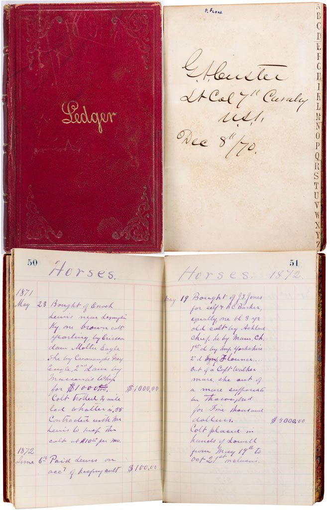 Custer had a passion for thoroughbred horses and ledger notations list a series of purchases for such mounts including purchase price, seller, location, bloodlines and in some cases, the clocked times at various distances for some of his purchases. Although Custer owned several horses, most, if not all of these purchased animals were for racing purposes. The ledger indicates that he was interested in both distance runners and trotters, and while he also used thoroughbreds for his cavalry mount, he never paid much more than $500 for them.