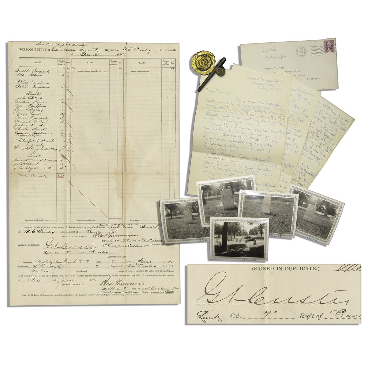 General George Custer 7th Cavalry document signed, dated 1 June 1874. Here, Custer approves deductions from the pay of 16 of his Band Company, 7th Regiment of U.S. Cavalry men, for the cost of a pound of tobacco each for the month of June 1874. Partially-printed document reads in full: ''Received, Fort Abraham Lincoln D.T., this 1st day of June, 1874, of Lieutenant A.E. Smith, 7th Regiment of U.S. Cavalry, A.A.C.S., Sixteen pounds and --- ounces of tobacco, in full of the above return; said tobacco to be issued by me to the above-named men, and to be charged against them, respectfully, on the muster and pay rolls of the Company for the months of May and June, 1874.'' Large ''G A Custer'' signature measures 3.5''. Additionally signed, ''Chas A Varnum, 2nd Lt. 7th Reg't of U.S. Cavalry for 1st Lieut. James Calhoun 7th Cavy, Commanding Band''. Notation to verso reads, ''Tobacco Return / In the month of June, 1874. / A.E. Smith / Lieut. 7 Reg't of Cav, A.A.C.S. / I certify that on this Tobacco Return I have issued / to Lt. James Calhoun / for N.C.S. of Reg't of Cav. / Sixteen / pounds --- ounces / of tobacco, / at Forty six cents per pound. / A.E. Smith / Lieut. 7 Reg't of Cav, A.A.C.S.'' Varnum, in command of the Crow and Arikara scouts suffered a leg wound during the Battle of Little Bighorn. 1pp. Measures 11'' x 17''. Some dampstaining and archival reinforcement to verso, else very good. Lot includes a trio of artifacts from the Battle of Little Bighorn: (1) a copper ''USA'' imprinted badge measuring 2'' in diameter; (2) a 3.25'' long hollow cylinder which appears to be from a pipe; (3) a 0.75'' diameter brass military eagle button with a ''Horstmann Philad'' backmark; presumably from the Harrisburg Collection, attributed by the City of Harrisburg, Pennsylvania as being from Custer's Last Stand. Accompanied by five 4.75'' x 3.75'' black and white photographs of the graves of Capt. Thomas W. Custer, Lieut. Algernon E. Smith, Lieut. James Calhoun, and Capt. George W. Yates, all killed at Little Bighorn, and buried at the 7th U.S. Cavalry plot. An incredibly varied collection.