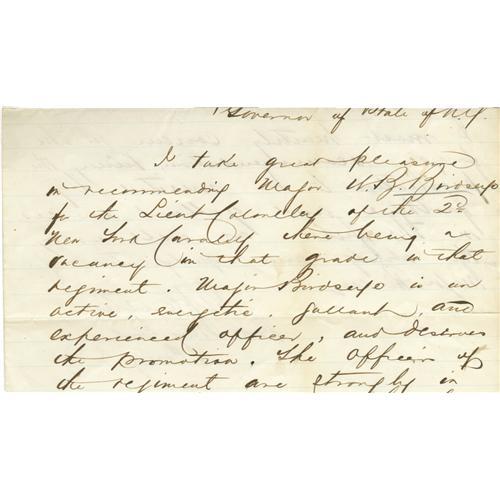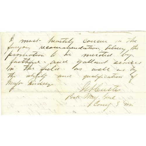 <B>General George Armstrong Custer Autograph Note Signed</B></I> "<I>G A Custer Bvt Maj Genl Comg 3 Div</B></I>". One page (front and back) of a lined 8" x 4.5" sheet excised from a longer full page letter, no place, no date 1864 , to the governor of the state of New York. In part, "<I>I take great pleasure in recommending Major M. B. Birdseye for the Lieut Colonelcy of the 2nd New York Cavalry there being a vacancy in that grade in that regiment. Major Birdseye is an active, energetic, gallant, and experienced officer, and desires the promotion...believing the promotion to be merited by faithful and gallant services in the field as well as by the ability and qualification of Major Birdseye.</B></I>" A check of Mortimer B. Birdseye's Civil War service record shows that Custer's recommendation was acted upon with Birdseye's promotion to lieutenant colonel taking effect on December 1, 1864. Fine condition.<BR><BR><b>Shipping:</b> Flat Material, Small (<a target="_blank" href="http://www.heritageauctions.com/common/shipping.php">view shipping information</a>)