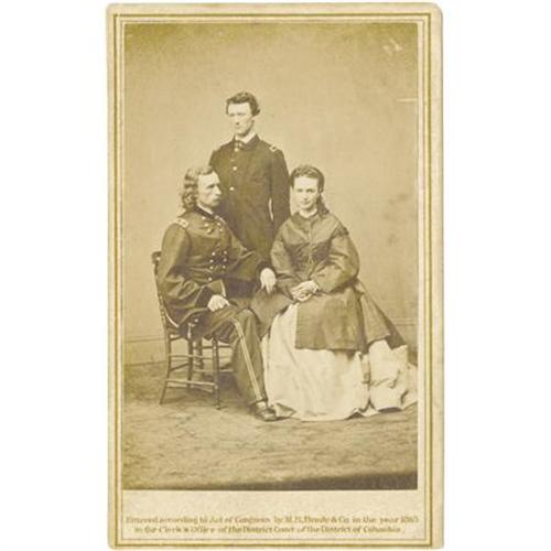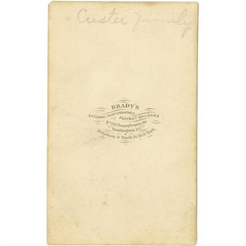 <B>MAJOR GENERAL GEORGE ARMSTRONG CUSTER, LIEUTENANT THOMAS WARD CUSTER, AND ELIZABETH CUSTER 1865 BRADY </B></I><B><I>CARTE DE VISITE</B></I></B></I><B>.</B></I> 2.5” x 4”, gilt rules surrounding image, with Mathew Brady copyright information at lower margin of the recto, Brady’s studio mark on the verso, a variation of image listed as K-49 in D. Mark Katz’s book <I>Custer in Photographs</B></I>. An excellent Brady image taken January 3, 1865 in Washington, D.C. featuring Custer, his wife and brother. Custer appears seated in his best uniform with Libby in her finery seated at his side and brother Tom standing between them. Though Thomas was six years junior to his famous brother, he held his own on the battlefield winning two Medals of Honor in three days in April of 1865. The brothers were to share a common destiny however, as both were killed at the Battle of Little Bighorn in 1876. The flaws that appear in the upper right corner of the image are from the original negative and not damage to the present image. A former owner has penciled “Custer Family” on the verso. <BR><BR><B>Condition:</B></I> The image is moderately toned with age with slightly bumped corners, else it is a fine example of an uncommon image. <BR><BR><b>Shipping:</b> Flat Material, Small (<a target="_blank" href="http://www.heritageauctions.com/common/shipping.php">view shipping information</a>)