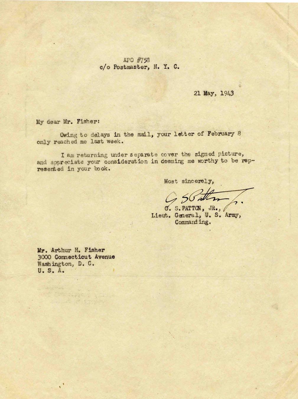 General George S. Patton Jr. typed letter signed during World War II. Dated 21 May 1943, Patton responds to Mr. Arthur H. Fisher's request for a signed photo. In part: ''I am returning the signed picture, and appreciate your consideration in deeming me worthy to be represented in your book. / Most sincerely / G.S. Patton Jr. / Lieut. General, U.S. Army, Commanding''. Accompanied by PSA/DNA Letter of Authenticity. Near fine.