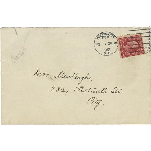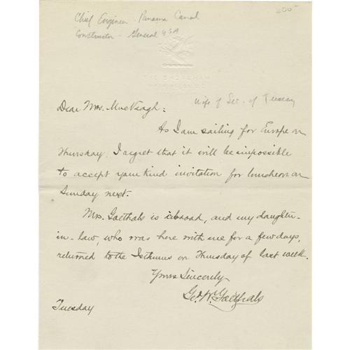 <B>General George Washington Goethals Autograph Note Signed</B></I> "<I>G. W. Goethals</B></I>". A one page note (with envelope) on Shoreham Hotel stationary, 5.25" x 7", n.d. November 10, 1912 to Mrs. Franklin MacVeagh, wife of the secretary of the Treasury, declining a dinner invitation. Goethals (1858 - 1928) was a United States Army officer and civil engineer, best known for his supervision of construction and the opening of the Panama Canal. A graduate of the United States Military Academy (1880), he taught civil and military engineering at the academy until 1888. During the Spanish-American War he was lieutenant colonel and chief of engineers of United States Volunteers. In 1907 President Theodore Roosevelt appointed George Washington Goethals chief engineer of the Panama Canal. The building of the Canal was completed in 1914, one year ahead of the target date. President Woodrow Wilson appointed him the first Civil Governor of the Panama Canal Zone.<BR><BR><b>Shipping:</b> Flat Material, Small (<a target="_blank" href="http://www.heritageauctions.com/common/shipping.php">view shipping information</a>)