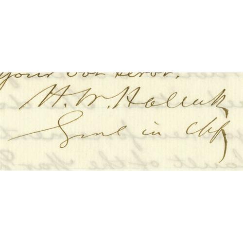 <B>General Henry Halleck: A Fine War-Date Letter to Benjamin "Beast" Butler,</B></I> over-ruling appointments Butler had made illegally. Written on November 3, 1862, on Headquarters of the Army letterhead. The body is in the hand of an aide, and signed by Halleck as "<I>Genl in Chf</B></I>". Two sides, 8" x 10", beautiful condition.<BR>Halleck apologizes for and explains the inability to send the requested reinforcements to Butler's New Orleans command. He then takes Butler to task for misunderstanding a General Order and making unauthorized appointments; Butler only had the authority to make recommendations. But it is not unusual that the self-promoting general overstepped his bounds.<BR><BR><b>Shipping:</b> Small Flat (<a target="_blank" href="http://www.heritageauctions.com/common/shipping.php">view shipping information</a>)