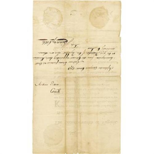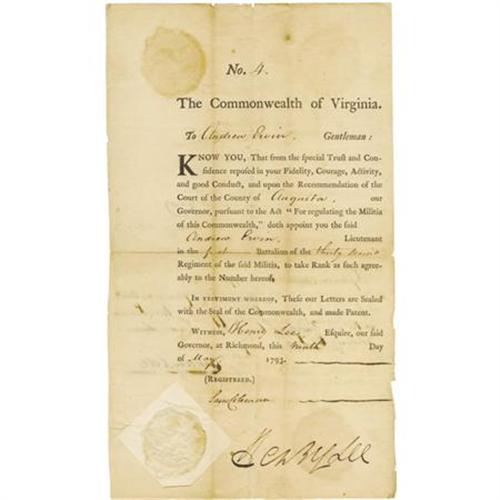 <B>Henry Lee Partly Printed Document Signed</B></I> “<I>Henry Lee</B></I>” as Governor of Virginia, one page, 7.25” x 12.5”. Richmond, May 9, 1793. Appointment of Andrew Ervin as Lieutenant in the first Battalion of the 32nd Regiment of Militia “<I>upon the Recommendation of the Court of the County of Augusta.</B></I>” Embossed paper seal affixed to left of Lee's bold signature. Autograph Document Signed “<I>J Kinney C AC</B></I>” on verso attesting that Ervin was sworn in as lieutenant in September 1793. Jacob Kinney served as Clerk of Augusta County from 1792-1809. Known as “Light Horse Harry” because of his achievements in the Revolutionary War, Henry Lee, father of Robert E. Lee, was Governor of Virginia from 1791-1794. He was commissioned Major General in 1798 and served in Congress from 1799-1801. At the request of Congress, Lee delivered President Washington's eulogy in which he characterized Washington as “First in war, first in peace, and first in the hearts of his countrymen.” Repaired at mid-horizontal fold on verso. Fine condition.<BR><BR><b>Shipping:</b> Flat Material, Small (<a target="_blank" href="http://www.heritageauctions.com/common/shipping.php">view shipping information</a>)