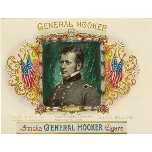<B><I>General Hooker</B></I></B></I> <B>1896 Sample Cigar Label by Schmidt & Co. of New York.</B></I> A lithographed 7.75" x 6" inner label with fancy gold and silver embossed decorative elements around a portrait of the (in)famous Union Major General Joseph Hooker. "Fighting Joe" Hooker had a long and controversial career as a U.S. Army officer who had a tendency to tip the bottle a bit too much. His headquarters at Falmouth, Virginia were once described as a combination of a "bar-room and a brothel." Though often stated as fact, the use of the word "hooker" as a slang term for prostitute did not come from the band of prostitutes that followed his division around though they were supposedly referred at the time as "General Hooker's Army" or "Hooker's Brigade." This sample label with Civil War and military appeal has the prices printed at the bottom stating that these were available from Schmidt & Co. for $2.50 per 100 (inside) and $1.00 per hundred (outside), also blank. Near mint condition.<BR><BR><b>Shipping:</b> Small Flat (<a target="_blank" href="http://www.heritageauctions.com/common/shipping.php">view shipping information</a>)