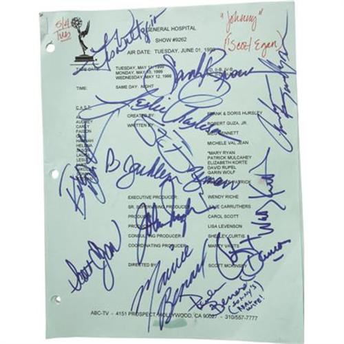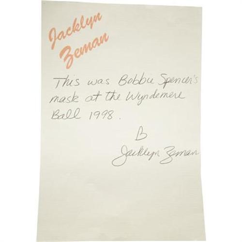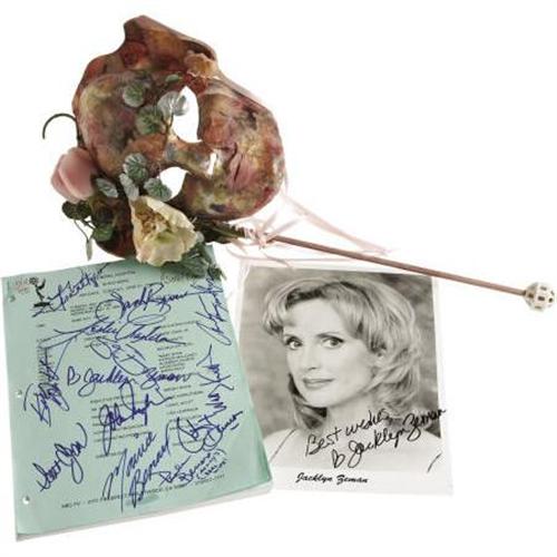 <B>"General Hospital" Props and Related Items.</B></I> Bobby Spencer's <I>papier mache</B></I> masquerade peach and pink ball mask with silk flowers and leaves with a pink ribbon, as worn -- and autographed within -- by actor Jacklyn Zeman at the Wyndemere Ball during the 1998 season of <I>General Hospital.</B></I> Also in this lot, a production script for episode #9262 originally airing on June 1, 1999, autographed on its green cover by eleven cast members including Miss Zeman, a black & white autographed headshot of Zeman and a short handwritten note penned by the actress describing the mask. Acquired from Jacklyn Zeman. <I>Authenticated by the world's foremost curators of television artifacts, The Comisar Collection of Beverly Hills.</B></I><BR><BR><b>Shipping:</b> Clothing, Costumes & Jerseys (<a target="_blank" href="http://www.heritageauctions.com/common/shipping.php">view shipping information</a>)