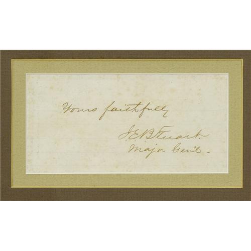 <B>Confederate Cavalry General JEB Stuart Autograph,</B></I> "<I>Yours faithfully JEB Stuart, Major Gen'l</B></I>", 5" x 2.5". Although penned on lined note paper, this does not appear to be a clipped signature. Well-centered and bold. Fine condition. Professionally matted and framed with a portrait of Stuart to an overall display size of 10" x 15".<BR><BR><b>Shipping:</b> Large Collectibles (<a target="_blank" href="http://www.heritageauctions.com/common/shipping.php">view shipping information</a>)