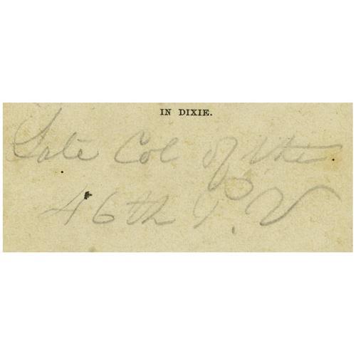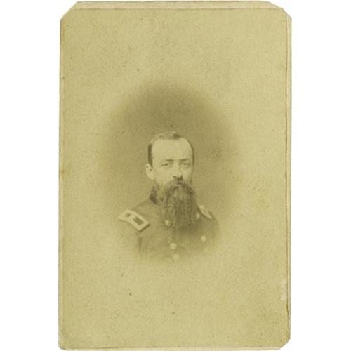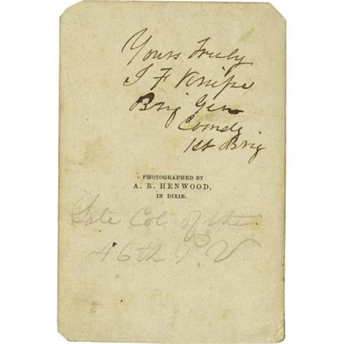 <B>General J.F. Knipe Signed <I>Carte de Visite</B></I>.</B></I> Signed: "<I>Yours Truly J F Knipe Brig Gen Comdg. 1st Brig</B></I>". Union officer, who served in the Army of the Potomac and the Cumberland. After the fall of Atlanta he became chief of cavalry of the Army of Tennessee. He received four wounds in different battles, and lived out his life in civil service and leisure. A very fine photograph of the general; a bust shot, featuring him in his Union blues, and a long cultivated beard. Signed on the verso. Bears an A.R. Henwood imprint. In fine condition; light overall toning on both sides; emulsion slightly yellowed; pencil notations on verso; trimmed corners; no border.<BR><BR><b>Shipping:</b> Small Flat (<a target="_blank" href="http://www.heritageauctions.com/common/shipping.php">view shipping information</a>)