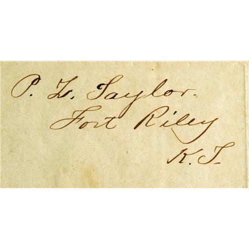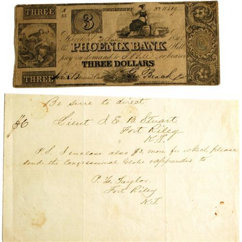 <B>CSA General JEB Stuart Autograph Note Signed</B></I> "<I>Lieut J. E. B. Stuart</B></I>" (1833-1864) Confederate major general of cavalry, who led a daring reconnaissance of McClellan's forces, riding around the entire army. Later turned up late at Gettysburg leaving Lee "blind". Mortally wounded at Yellow Tavern. ANS, Fort Riley, in full: "<I>Be sure to direct Lieut J. E. B. Stuart Fort Riley K. T. P. S. I enclose also $3 more for which please send the Congressional Globe & appendix to P. F. Taylor Fort Riley K. T.</B></I>" A magnificent signature which alone can fetch upwards of $5,000. Representative $3 bill included.<BR><BR><b>Shipping:</b> Small Collectibles (<a target="_blank" href="http://www.heritageauctions.com/common/shipping.php">view shipping information</a>)