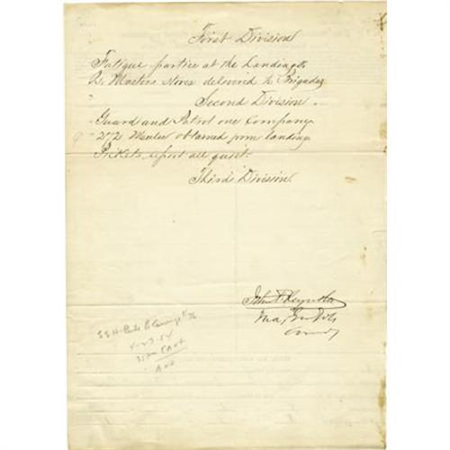 <B>John F. Reynolds Partly Printed Document Signed</B></I> “<I>John F. Reynolds/Maj Gen Vols/Comdg,</B></I>” two pages, 7” x 10”, front and verso. Headquarters, 1st Corps, March 15, 1863. “<I>Daily Memoranda for information of the Major General Commanding</B></I>” indicating 15 furloughs and 10 leaves of absence were granted. Reynolds signed on the second page beneath the following manuscript list: “<I>First Division/Fatigue parties at the Landings/Q. Masters stores delivered to Brigades/Second Division/Guard and Patrol one Company/272 Meules obtained from landing/Pickets report all quiet./Third Division.</B></I>” Reynolds signed, leaving room for information of the Third Division to be added. Brigadier General John F. Reynolds assumed command of the 1st Corps of the Army of the Potomac in late 1862. On March 4, 1863, President Lincoln nominated Reynolds to be Major General; his nomination was consented to by the U.S. Senate on March 9th, just six days before he signed this document as Major General Volunteers. On the morning of July 1, 1863, the first day of the Battle of Gettysburg, Reynolds was commanding the left wing of the Army of the Potomac. As Reynolds was supervising the placement of the 2nd Wisconsin, he was shot in the back of his neck and fell from his horse; he died almost instantly. He is memorialized by three statues in the Gettysburg National Memorial Park, one on his horse. Anything signed by John F. Reynolds is scarce and this military document, signed less than four months before his death at age 42, is especially desirable. Light penciled notations by collector. Printed side is trimmed at left edge and has mounting traces on corners. Fine condition.<I> Ex. Henry E. Luhrs Collection. </B></I><BR><BR><b>Shipping:</b> Flat Material, Small (<a target="_blank" href="http://www.heritageauctions.com/common/shipping.php">view shipping information</a>)