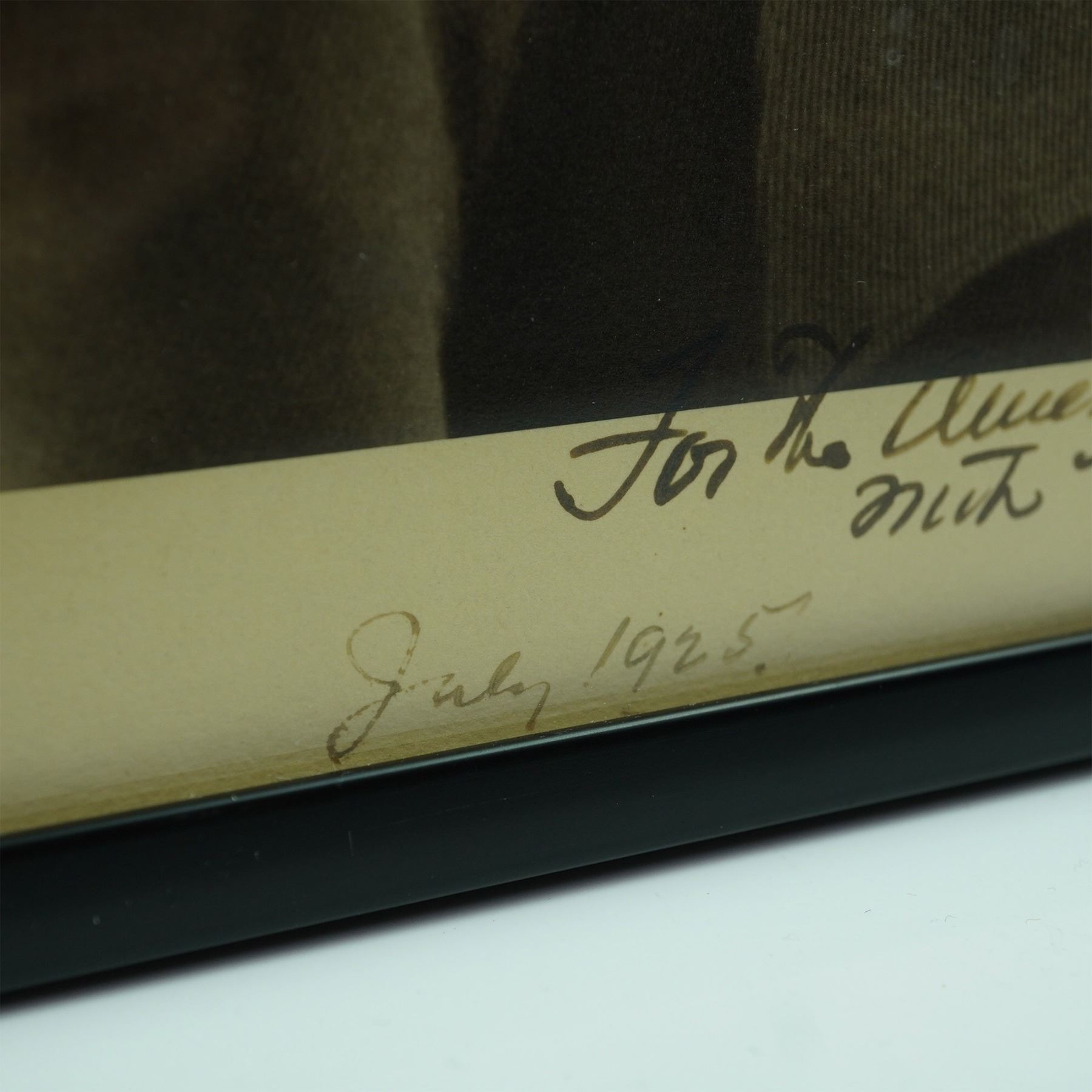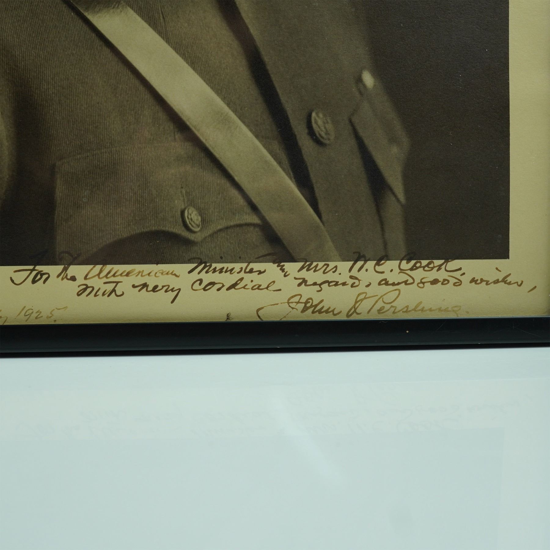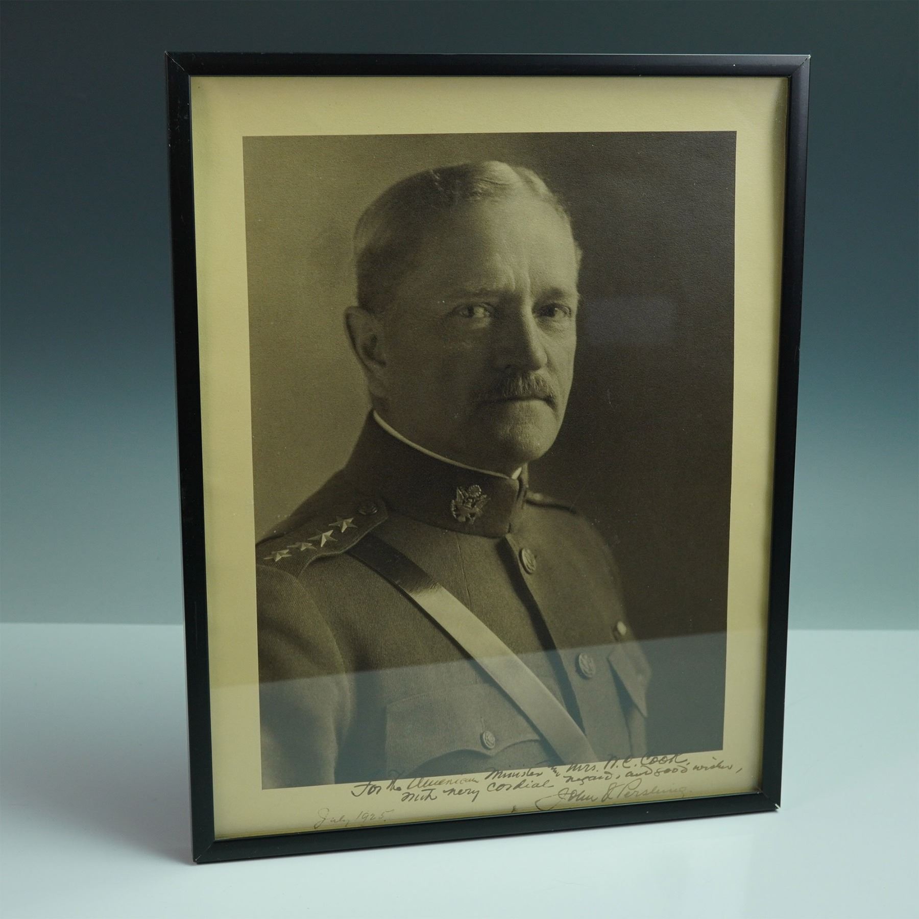 A sepia-toned photographic portrait of General John J. Pershing, inscribed and signed in ink below the image: "For the American Minister & Mrs. H.C. Cook, with very cordial regard and good wishes, John J. Pershing, July 1925." The photo is attractively framed under glass in a black frame. The image captures Pershing in full uniform, complete with the four-star insignia he was promoted to during his tenure as General of the Armies. A significant artifact tied to one of the most decorated military leaders in American history.