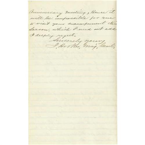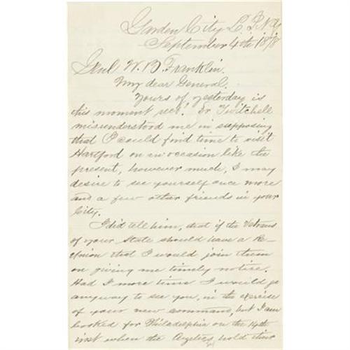 <B>General Joseph Hooker Autograph Letter Signed</B></I> “<I>J. Hooker Maj. Genl.</B></I>”. Two pages, 5” x 8”, Garden City, New York, September 4, 1878, to General W. B. Franklin. In this letter “Fighting Joe” Hooker responds to a fellow general's invitation to attend an upcoming veteran's encampment. He writes in part: “<I>I am booked for Philadelphia on the 14th last when the Azetecs sic hold their Anniversary meeting. Hence it will be impossible for me to visit your encampment.</B></I>” Both generals had seen much action during the Civil War. Hooker had long since retired from military service by this time and Franklin's post-war career involved a foray into politics and acting as general manager of Colt Firearms in Hartford, Connecticut. With the usual fold creases, else a bright, sharp letter in fine condition. <I>From the collection of Henry E. Luhrs.</B></I><BR><BR><b>Shipping:</b> Flat Material, Small (<a target="_blank" href="http://www.heritageauctions.com/common/shipping.php">view shipping information</a>)