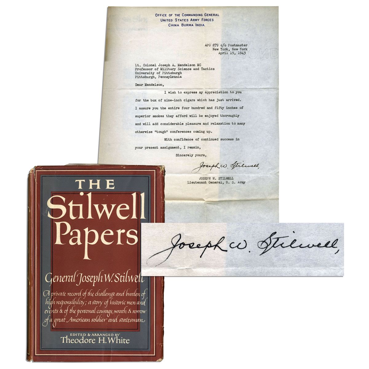 WWII Pacific theatre General signs ''Joseph W. Stilwell'' to a 1943 typed letter on ''Office of the Commanding General / China Burma India'' stationery. He thanks General Mendelson for sending cigars, asserting, ''…the entire four hundred fifty inches of superior smokes…will be enjoyed…'' Letter is tipped into his memoir ''The Stilwell Papers'' published in 1948. Half-title is signed ''Mendelson''. A letter from the publisher to Mendelson is also tipped into this first edition. Stilwell letter is 7.75'' x 10.5''. Very good condition. Rare.