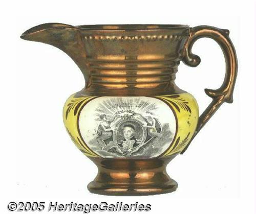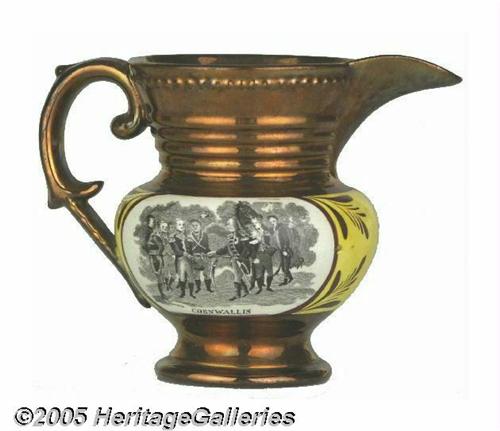 <B>General Lafayette Copper Luster Pitcher</B></I> This attractive style was manufactured in England for the American market. They are found with three historical subjects in many sizes and shapes including Andrew Jackson, William Henry Harrison, and General Lafayette (with scene of the surrender of Cornwallis to Washington on the back). Almost certainly produced to mourn Lafayette, the last surviving Revolutionary War leader who died in 1834. This is one of the smaller sizes, probably for use as a creamer. Perfect condition, which is rarely seen on these copper lusters (the often-chipped luster portions are almost impossible to restore convincingly). Height 3.75", diameter including handle 4.75". Lot:252