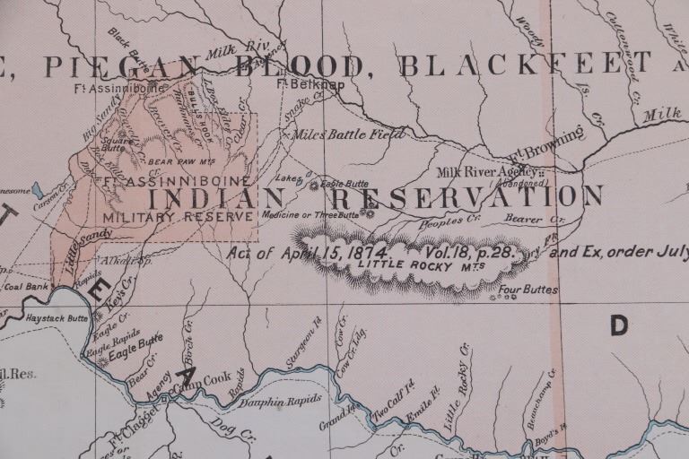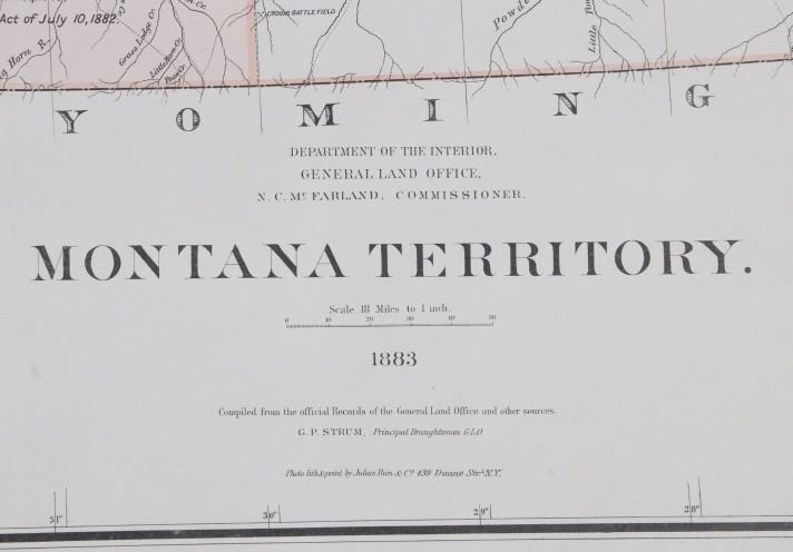 This is an 1883 map of the Montana Territory complied from the official records of the General Land Office, and other sources. G.P. Strum, Principal Draughtsman, G.L.O. This photo lithograph print is by Julius Bien & Co 439 Duane Str. N.Y. . The map is marked "Department of the Interior General Land Office N.C. McFarland, Commissioner Montana Territory 1883". The map shows the distinct county lines as well as the vast lands designated as Indian reservations. The Montana Territory map is in good condition with a small tear at the seem on the bottom center. It measures 27" x 34".