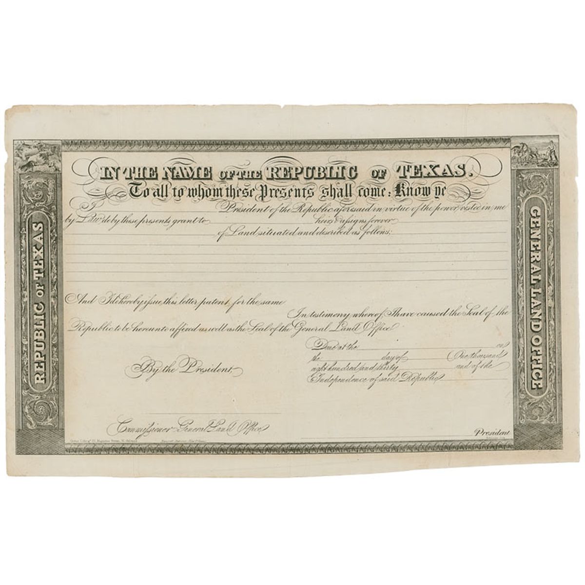 Two attractive unissued Republic of Texas land grants, both 16.75 x 10.5, circa 1830s, produced by Greene Lithographers and Bancroft Stationers of New Orleans. The ornate borders bear two vignettes, one of a herd of cattle, the other of man behind a horse-drawn plow. Central horizontal and vertical fold, a few trivial edge chips, and some scattered light creases and toning, otherwise fine condition. The Robert Davis Collection.