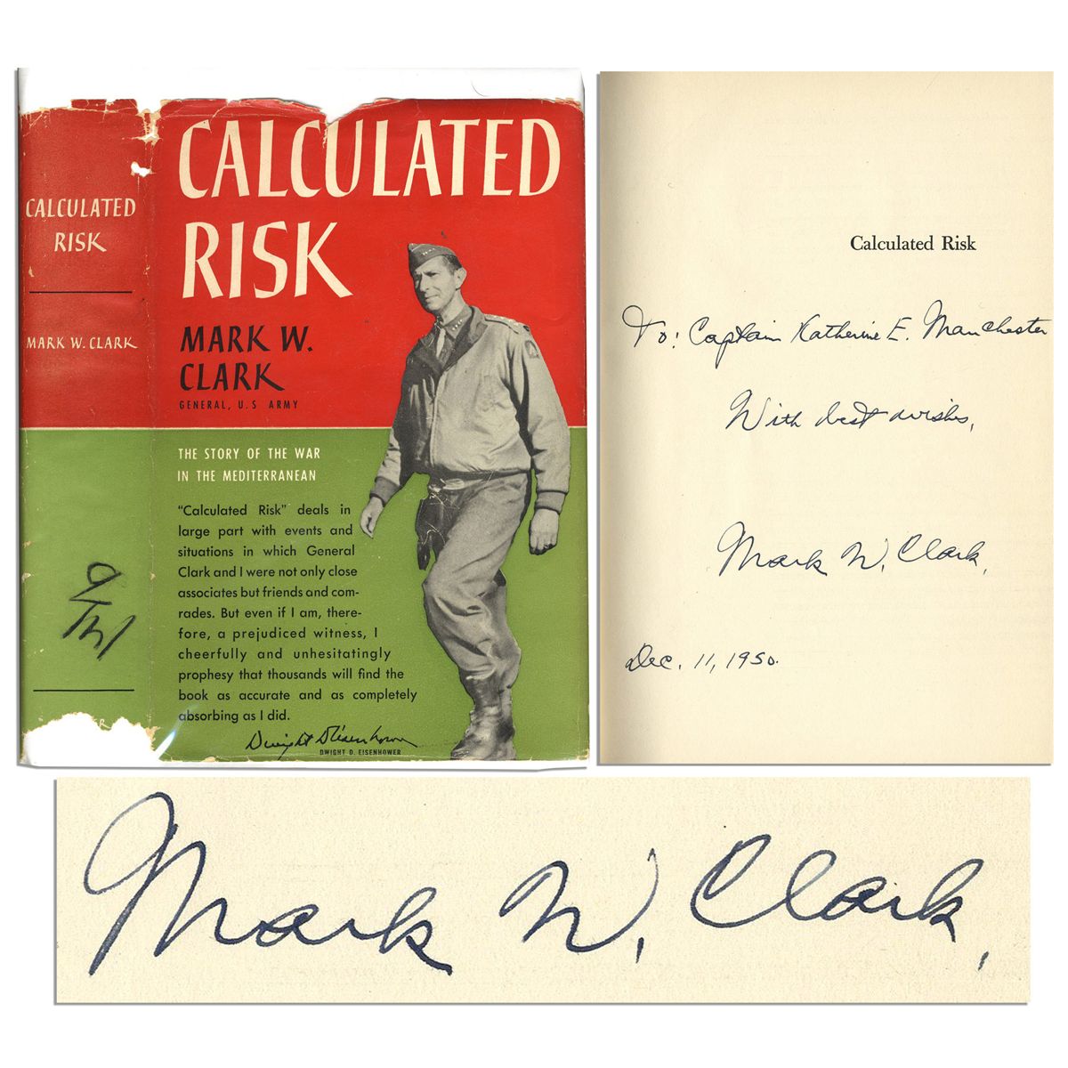 World War II General Mark W. Clark signed first edition of ''Calculated Risk'' published by Harper & Brothers Publishers: New York: 1950. Clark inscribes on the fly-leaf, ''To Captain Katherine E. Manchester / With best wishes, Mark W. Clark, Dec, 11, 1950.'' Clark's frank and controversial memoir includes his personal account of Operation Torch, the invasion of French North Africa under his command. Book runs 500pp. and measures 5.75'' x 8.5''. Some chipping to dustjacket and light toning to pages. Overall very good condition.