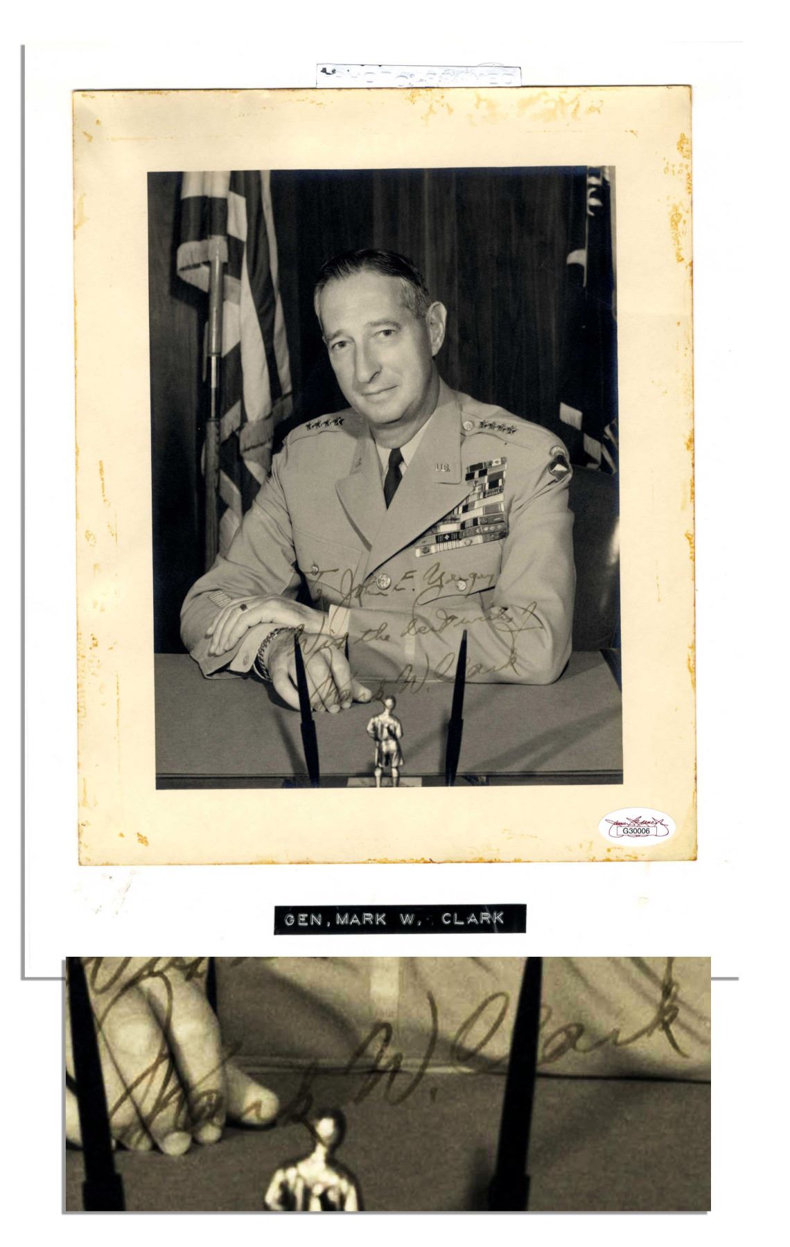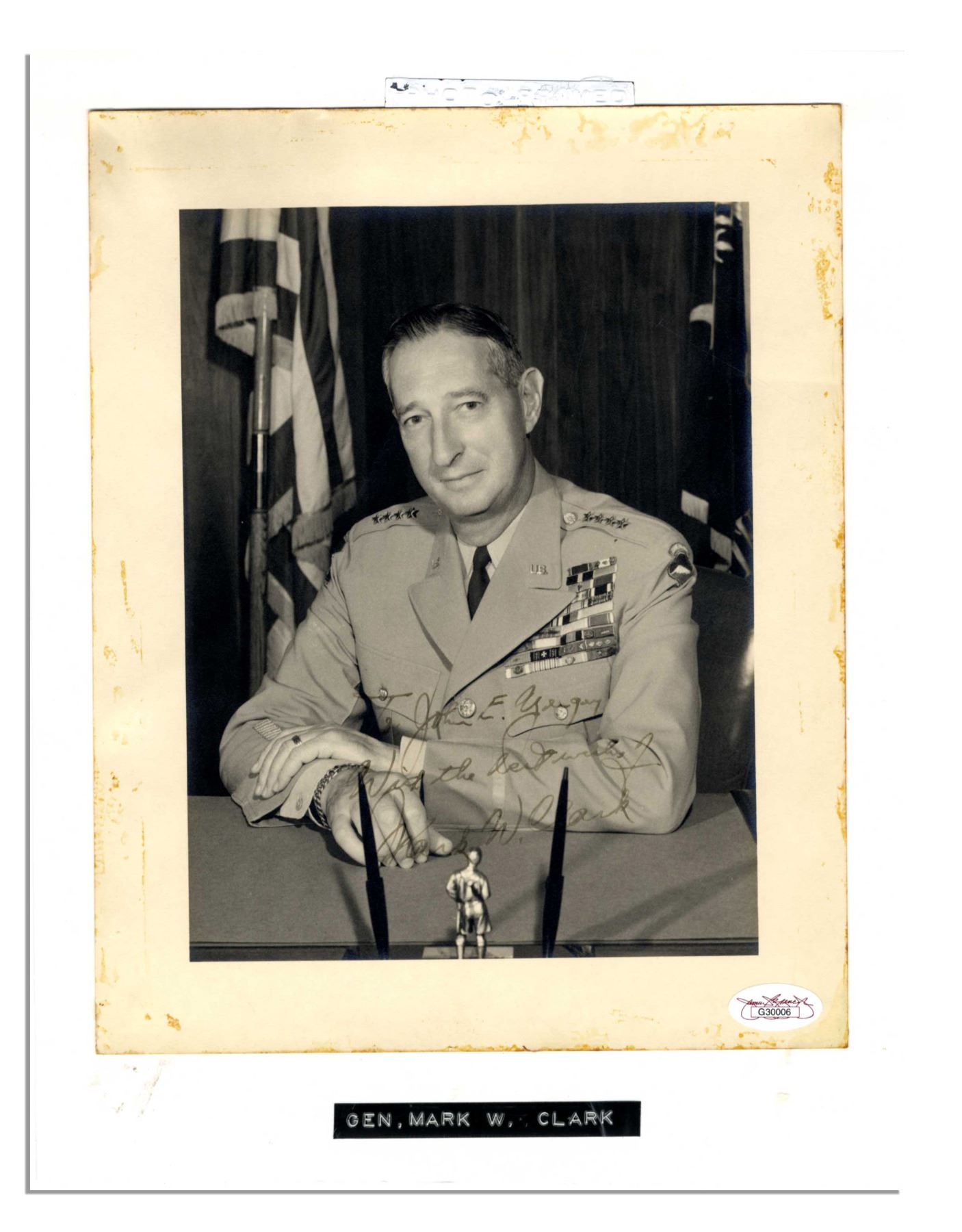General Mark W. Clark signed 8'' x 10'' matte photo. The four star general signs: ''Mark W. Clark''. Photo is affixed to a 9.25'' x 12'' paper backing. Moderate fading to signature, else near fine. With JSA COA.