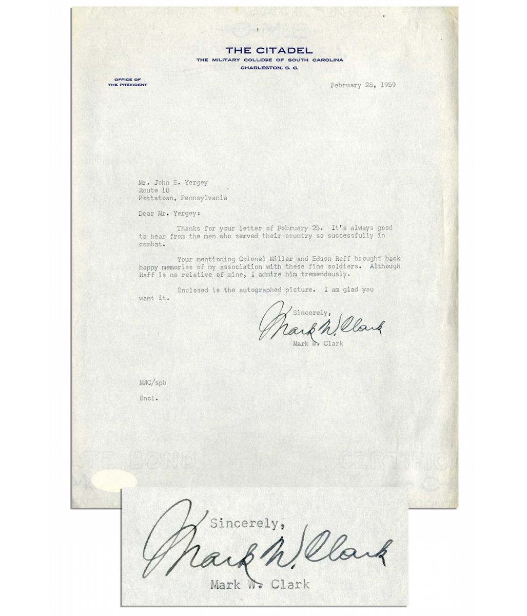 General Mark W. Clark typed letter signed ''Mark W. Clark'' on The Citadel letterhead when he served as its President. Dated 28 February 1959, letter reads in part, ''...It's always good to hear from the men who served their country so successfully in combat. Your mentioning Colonel Miller and Edson Raff brought back happy memories of my association with these fine soldiers. Although Raff is no relative of mine, I admire him tremendously...'' Measures 8.5'' x 11.'' Near fine. With JSA COA.