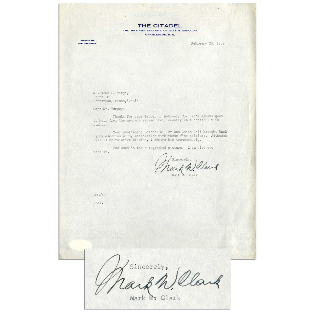 General Mark W. Clark typed letter signed ''Mark W. Clark'' on The Citadel letterhead when he served as its President. Dated 28 February 1959, letter reads in part, ''...It's always good to hear from the men who served their country so successfully in combat. Your mentioning Colonel Miller and Edson Raff brought back happy memories of my association with these fine soldiers. Although Raff is no relative of mine, I admire him tremendously...'' Measures 8.5'' x 11.'' Near fine. With JSA COA.