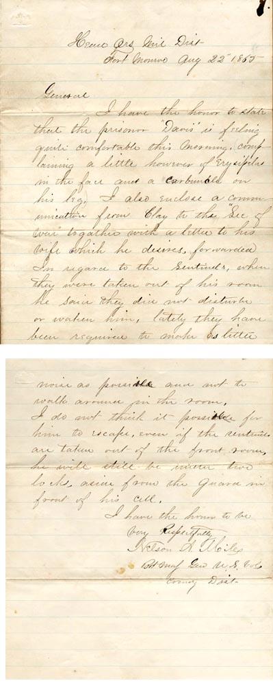 General Nelson Miles autograph letter signed, dated 22 August 1865, from ''Head Quarters Military District, Fort Monroe,'' regarding Jefferson Davis, who was imprisoned at Fort Monroe in Virginia for treason. Letter, addressed to an unknown General, but most likely Assistant Adjutant General Edward Townsend to whom Miles sent all his prisoner reports, reads in full, ''I have the honor to state that the prisoner 'Davis' is feeling quite comfortable this morning, complaining a little however of erysipelas in the face and a carbuncle on his leg. I also enclose a communication from [Clement] Clay to the 'Sec of War' together with a letter to his wife which he desires, forwarded. In regard to the Sentinels, when they were taken out of his room he said they did not disturb or waken him, lately they have been required to make as little noise as possible and not to walk around in the room. I do not think it possible for him to escape, even if the sentinels are taken out of the front room, he will still be under two locks, aside from the Guard in front of his cell.'' Letter, measuring 7.75'' x 9.75'', is on two conjoined pages, and has an ink stain at top right of first page. Letter has been reinforced on verso at folds. Very good condition.