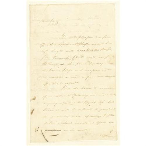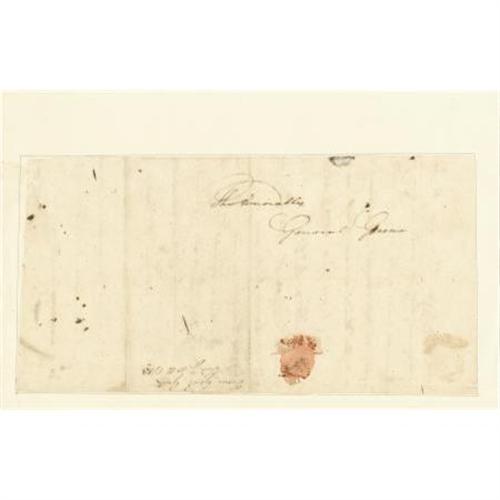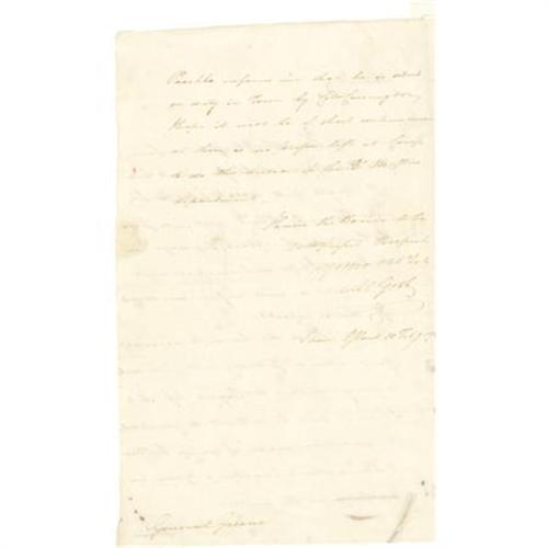 <B>Mordecai Gist Autograph Letter Signed</B></I> “<I>M. Gist,</B></I>” two pages, 7.5” x 12.25”, front and verso, with integral leaf addressed by Gist to “<I>The Honorable/General Greene.</B></I>” Address leaf is inlaid to 8.5” x 13”. James Island, February 10, 1783. In part, “<I>I have the pleasure to inform you that Captain McPherson arrived here last night with 15,000 D Salted Beef from Fenwick Island wch will serve the Troops at this place six days. In the interim I hope such measures will be adopted as will answer our demands after that is expended…</B></I>” In 1779, Modecai Gist was appointed Brigadier General in the Continental Army and took command of the 2nd Maryland Brigade and, in 1780, saw action at the Battle of Camden, South Carolina. Joining the southern army under General Nathaniel Greene, Gen. Gist recruited and supplied Greene's army in the Carolinas, retiring in November 1783. Uniformly soiled, with ink marks in the lower left margin. Partial separation of the letter and address leaf at top. Overall, fine condition.<BR><BR><b>Shipping:</b> Flat Material, Small (<a target="_blank" href="http://www.heritageauctions.com/common/shipping.php">view shipping information</a>)