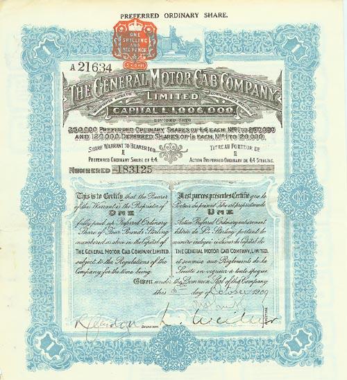 1909, France. Stock certificate for 1 share. Blue/Black. Vignette of early motor vehicle.