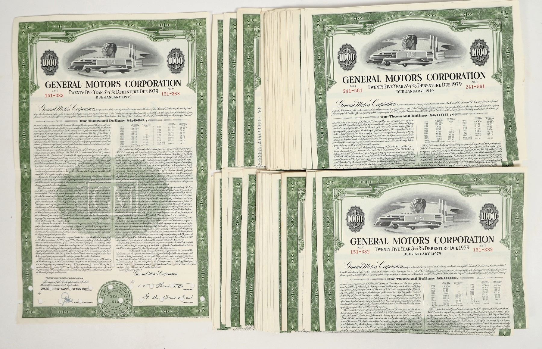 Lot of approx. (50) large folded General Motors Corporation $1000 Bond Twenty-Five Year 3 1/4% Debenture Certificates. Numbered certificates are dated at bottom (extensive fine print) for January 1954. Punch cancelled, the reverse sides are not executed. Near-mint condition, unusual certificates. Please see photos.