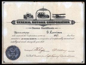 New York Division, 1920. Bonus certificate for exceptional work "Dayton Engineering Laboratories Division". Automobiles and Bi-plane vignettes w/ silver GM seal. Toning and stain in one corner. C.F. Kettering sig., Fine to VF. Scarce early GM related certificate.