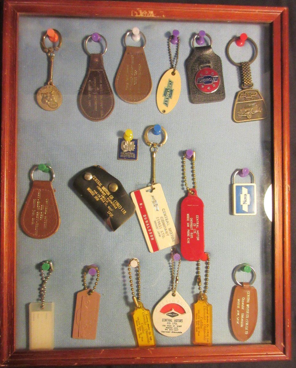 Key Tags from various General Motor Dealerships, with a General Motors Pin inside wood and glass display case