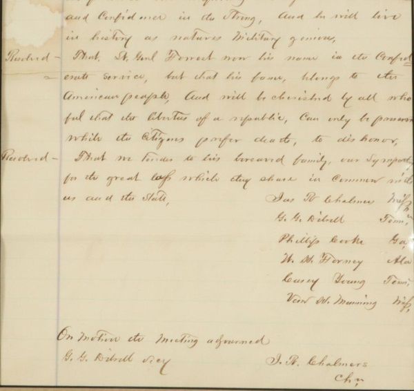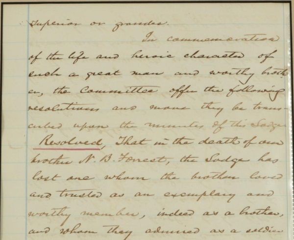 Two 1877 death resolutions for Confederate Civil War General Nathan Bedford Forrest signed by many of his commrades. Held in the rooms of the Honorable Casey Young in the city of Washington, October 30, 1877. Written and singed by General G.G. Dibrell. Both images measure 8" x 11 3/4". Frame measures 25" wide x 22 1/2" tall. AND, Resolutions Adopted by the Chickasaw Lodge upon the death of Brother N.B. Forrest. Tribute signed by Robert Hutchinson as Secretary of the Chickasaw Lodge #8 I.O.O.F. of Memphis, Tenn., November 5, 1877. 3 letters, text front and back, nicely framed. Back of frame is also matted to see back of letters. Each letter measures 8" x 12 1/2". Frame measures 34 1/2" wide x 23" tall.