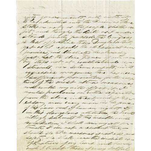 <B>General Nathaniel Lyon Autograph Letter Signed</B></I> "<I>N. Lyon.</B></I>" One page (last page of a longer letter; the rest is missing), 7.75" x 9.75", np, nd. The content of this letter reflects the staunch attitude Lyon held regarding succession, he greatly opposed Missouri's succession and even disguised himself as a farm woman in order to spy on the troops training for home defense. Lyon was the first Union General to be killed in the Civil War. The letter reads in part, "<I>…with authority to be admitted into the Union as Slave States or not, as the people shall see fit, and though the Bill as I understand finally passed the Congress, is less offensive than Douglass' Bill, yet as it repeals the Missouri Compromise, and illustrates the alarming fact, that the slave power of our country stops not at constitutional restraints, nor solemn compacts… If in this dangerous attitude, the north willingly submits to this insult and degradation, I shall deem myself fortunate I am not a resident there…</B></I>" <BR><BR>The letter is in fine condition; usual folds are present; water damage stains present on lower edge of the verso; the letter is not complete, we only have the final page of what was a longer letter. From the Henry E. Luhrs Collection.