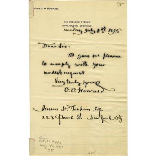 <B>General Oliver Otis Howard Autograph Letter Signed</B></I> “<I>O. O. Howard</B></I>”. One page, 5.5” x 8.25”, on Howard's personal letterhead, Burlington, Vermont, July 1, 1895, in ink, to James D. Perkins, New York. The letter reads in full: “<I>Dear Sir: It gives me pleasure to comply with your modest request. Very truly yours O. O. Howard</B></I>”. Oliver O. Howard (1830-1909) was a career army officer and Union general during the Civil War. Though he was awarded the Medal of Honor for his actions at the battle of Fair Oaks, he suffered humiliation at the battles of Chancellorville and Gettysburg. After the war Howard was namesake and a founding member of Howard University. The ink has bled through slightly affecting an integral sheet, else good condition. <I>From the collection of Henry E. Luhrs.</B></I><BR><BR><b>Shipping:</b> Flat Material, Small (<a target="_blank" href="http://www.heritageauctions.com/common/shipping.php">view shipping information</a>)