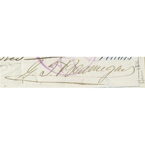 <B>General P. Gustave Toutant Beauregard Document Signed</B></I> "<I>G.T. Beauregard.</B></I>" Signed check, 8.25" x 2.5", Mutual National Bank, New Orleans, Louisiana, February 3rd, 1880, for the amount of $100. General Beauregard was a Confederate commander and <I>postbellum</B></I> he declined offers to command the armies of Romania and Egypt. <BR><BR>The check is in very fine condition; the cancellation stamp effects some of the signature but not the point of effecting the legibility. From the Henry E. Luhrs Collection. Accompanied by LOA from PSA/DNA.